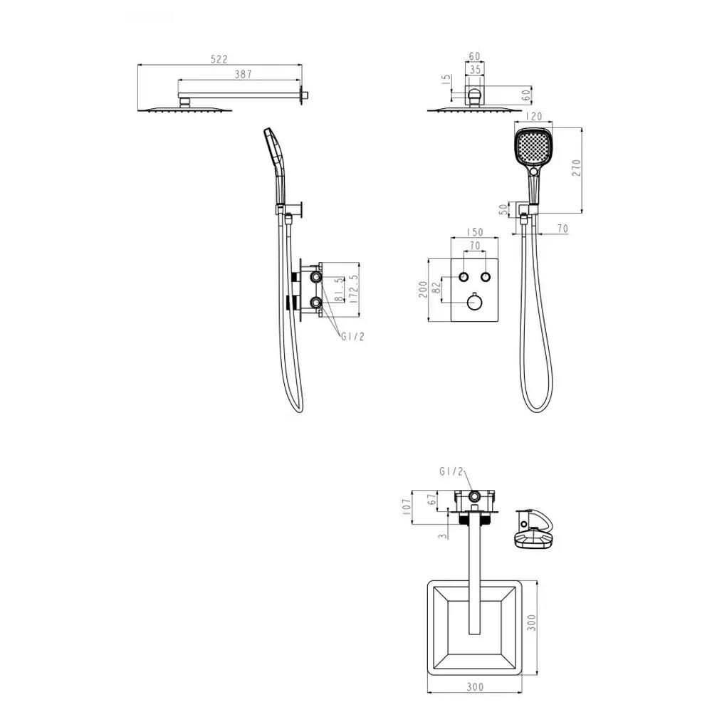 смеситель, внутренняя часть, шланговое подключение, держатель душевой лейки, лейка, душевой шланг, верхний душ с кронштейном