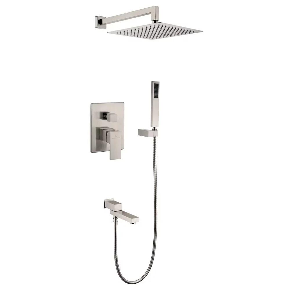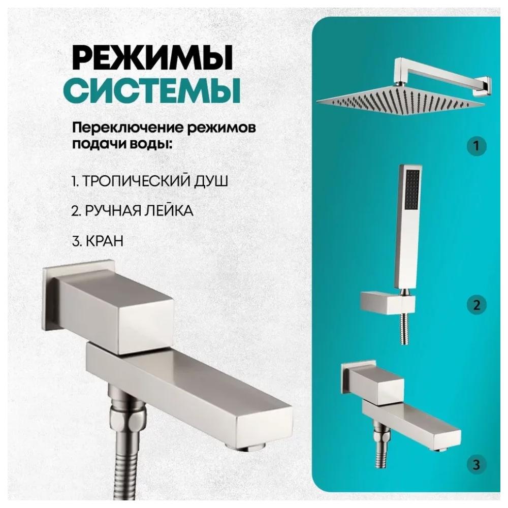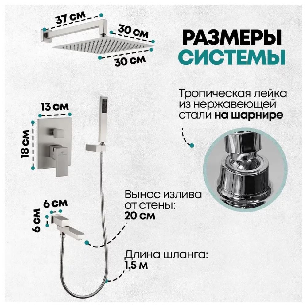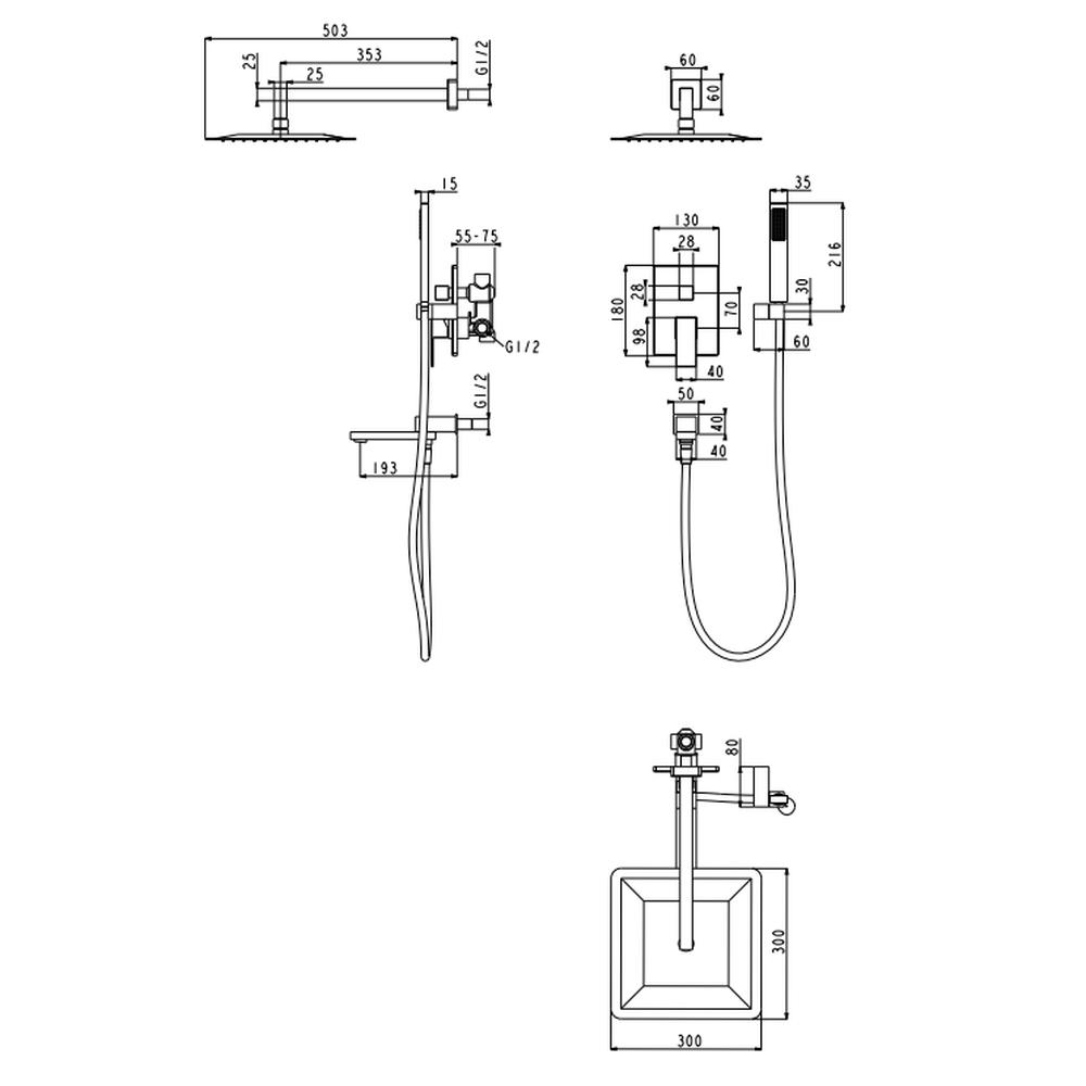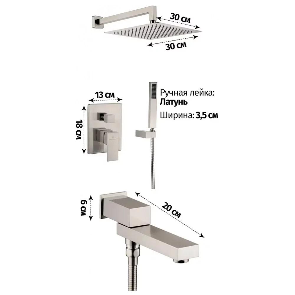 смеситель, внутренняя часть, шланговое подключение с изливом, держатель душевой лейки, лейка, душевой шланг, верхний душ с кронштейном