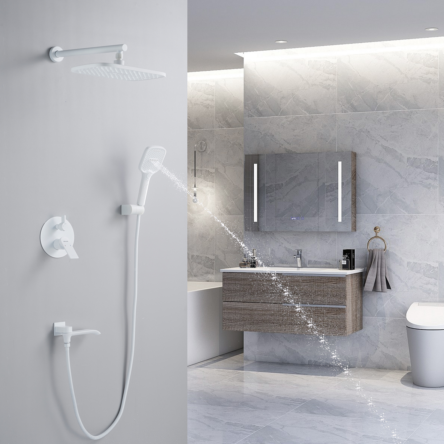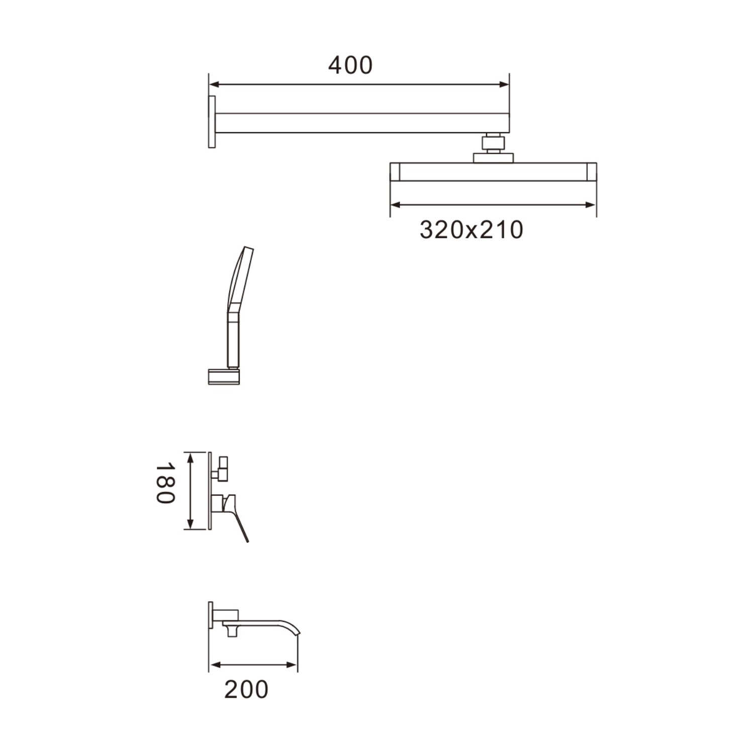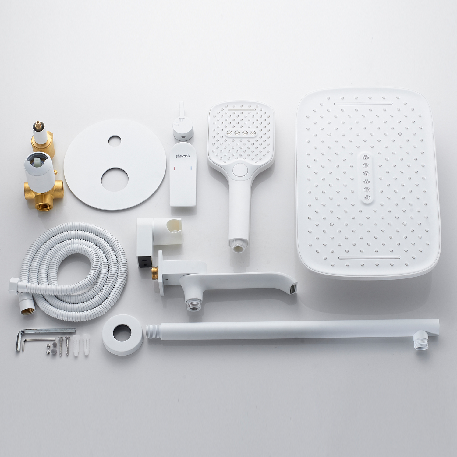 смеситель, внутренняя часть, шланговое подключение с изливом, верхний душ с настенным кронштейном, душевая лейка, настенный держатель лейки, душевой шланг