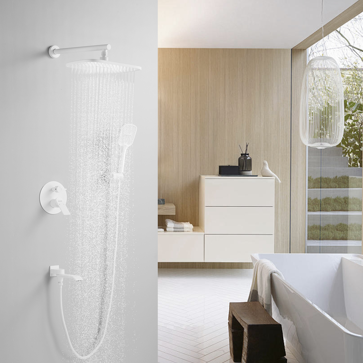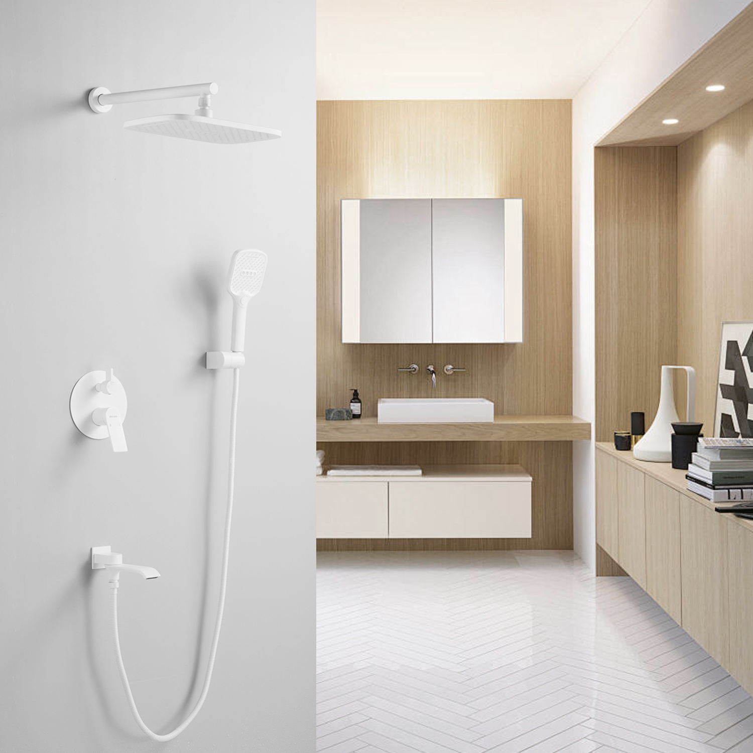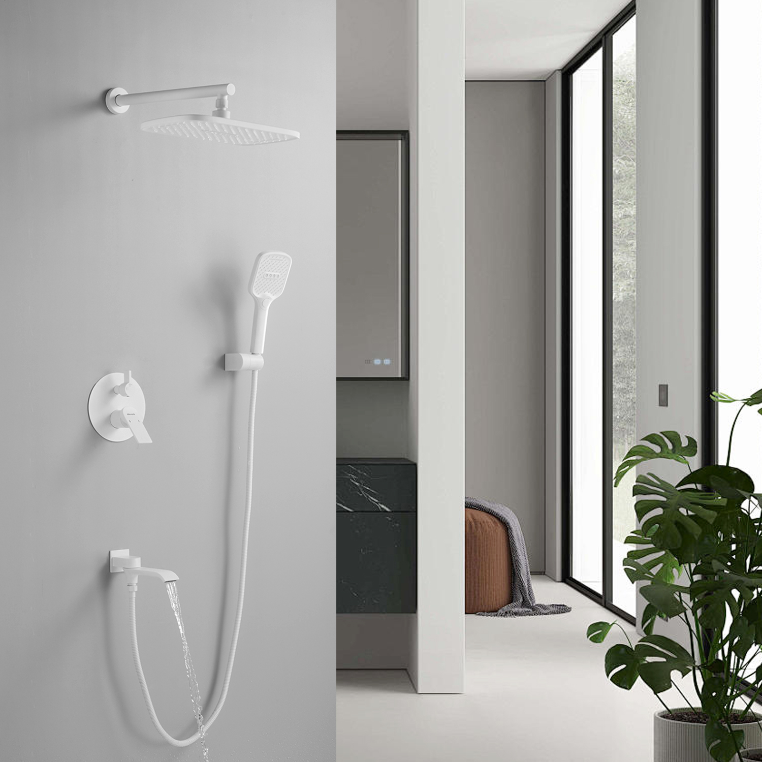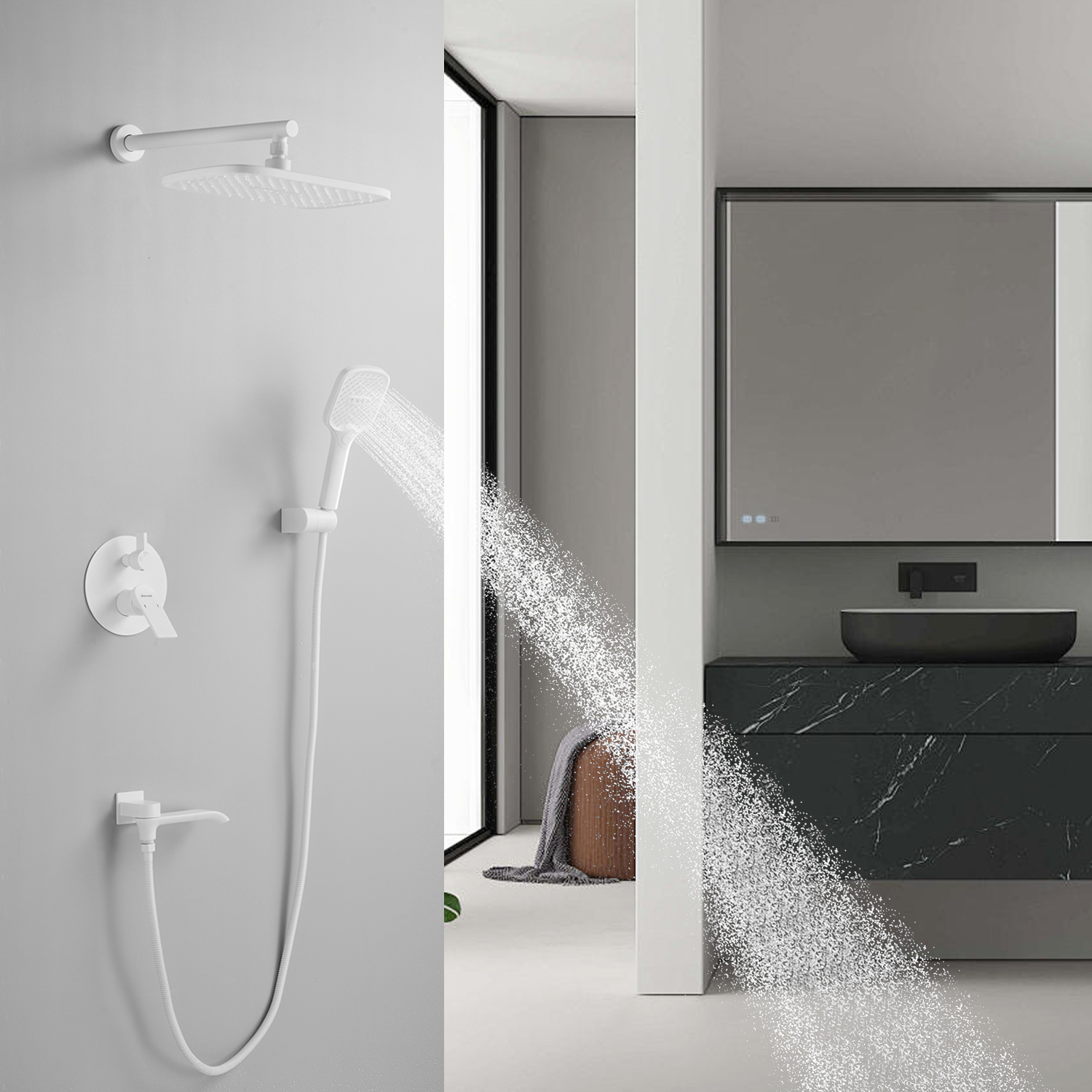 смеситель, внутренняя часть, шланговое подключение с изливом, верхний душ с настенным кронштейном, душевая лейка, настенный держатель лейки, душевой шланг