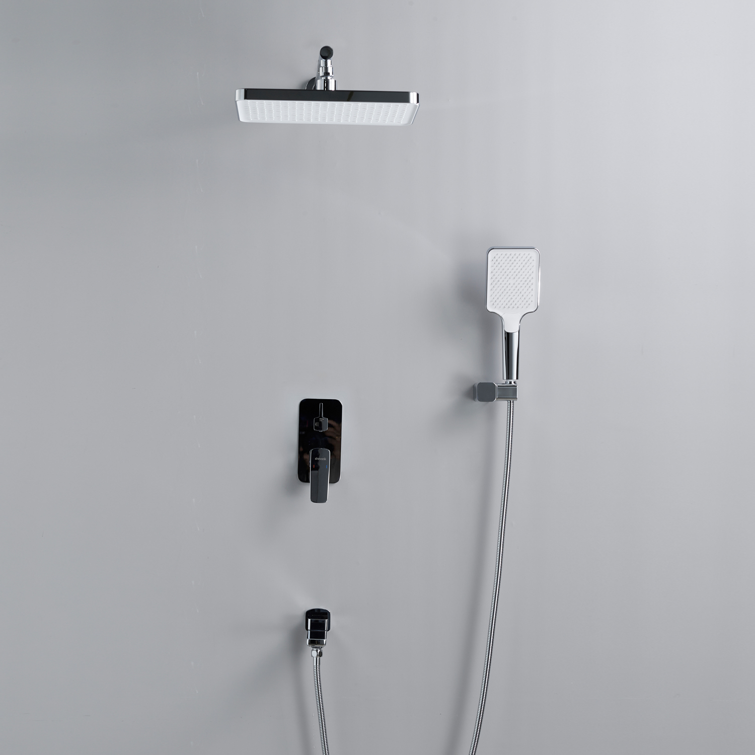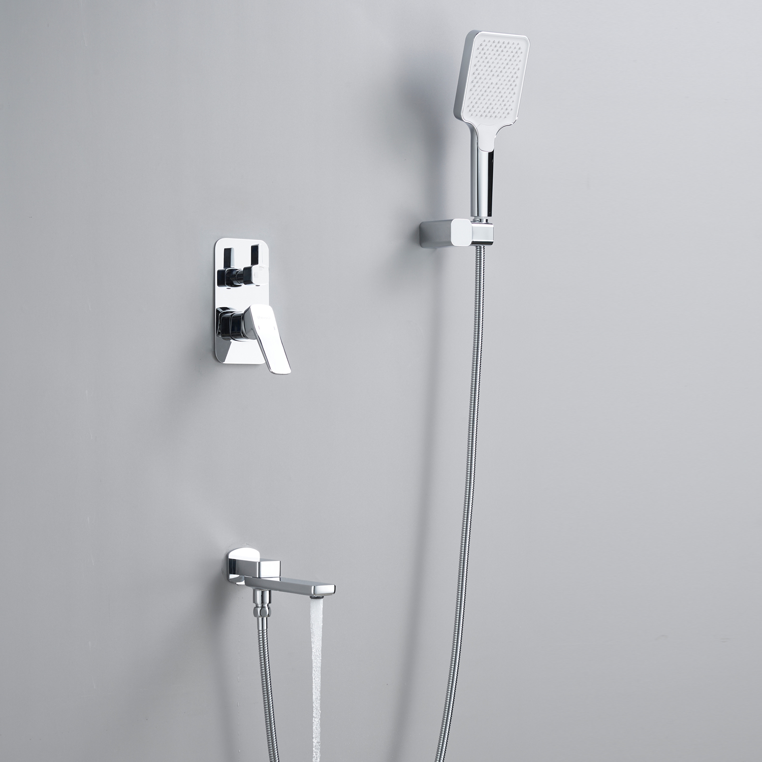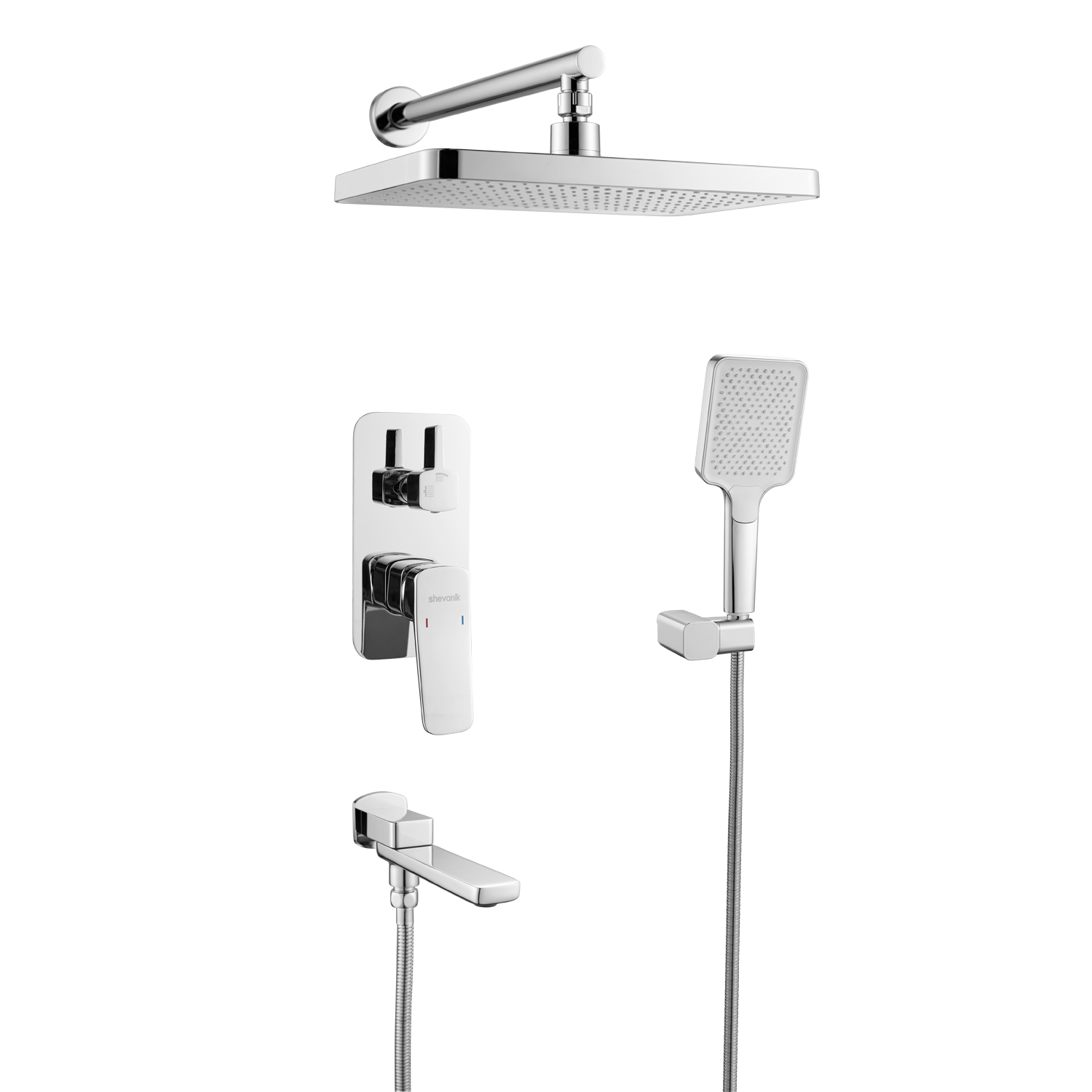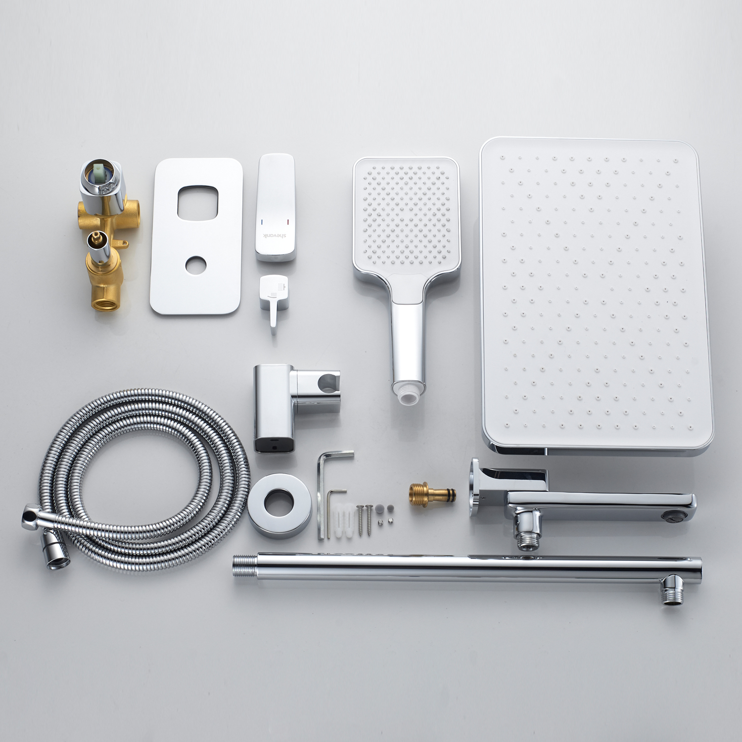 смеситель, внутренняя часть, шланговое подключение с изливом, верхний душ с настенным кронштейном, душевая лейка, настенный держатель лейки, душевой шланг