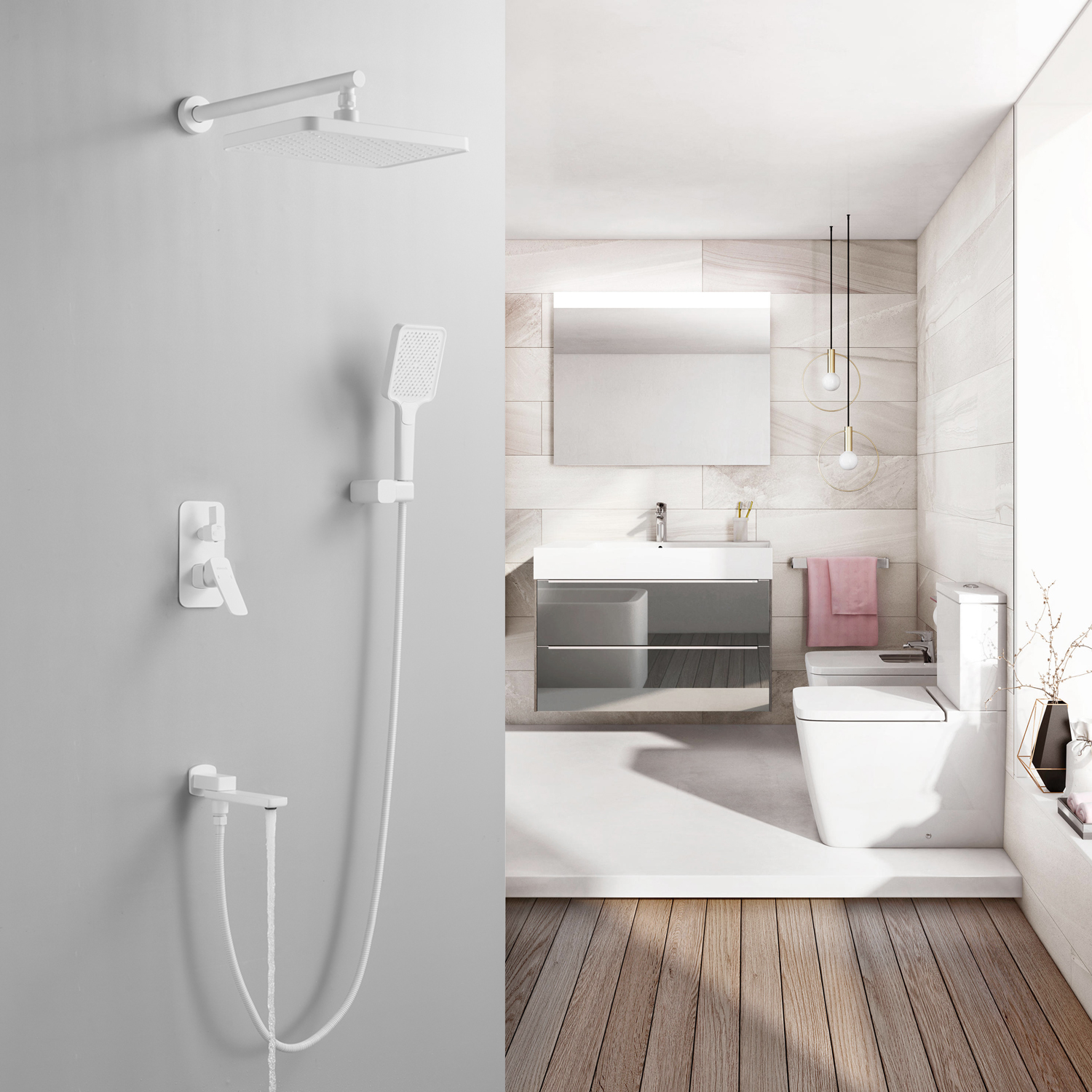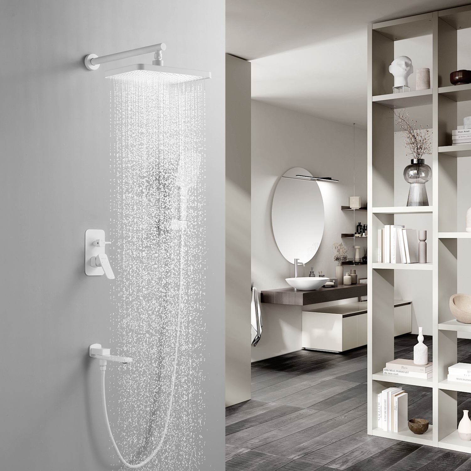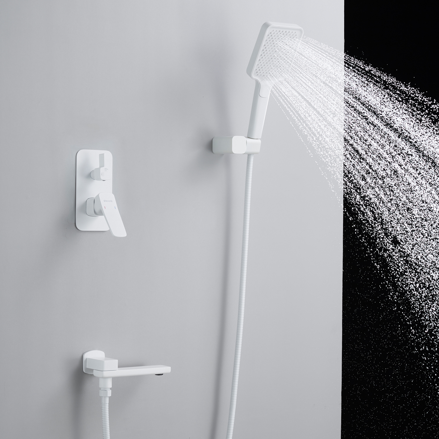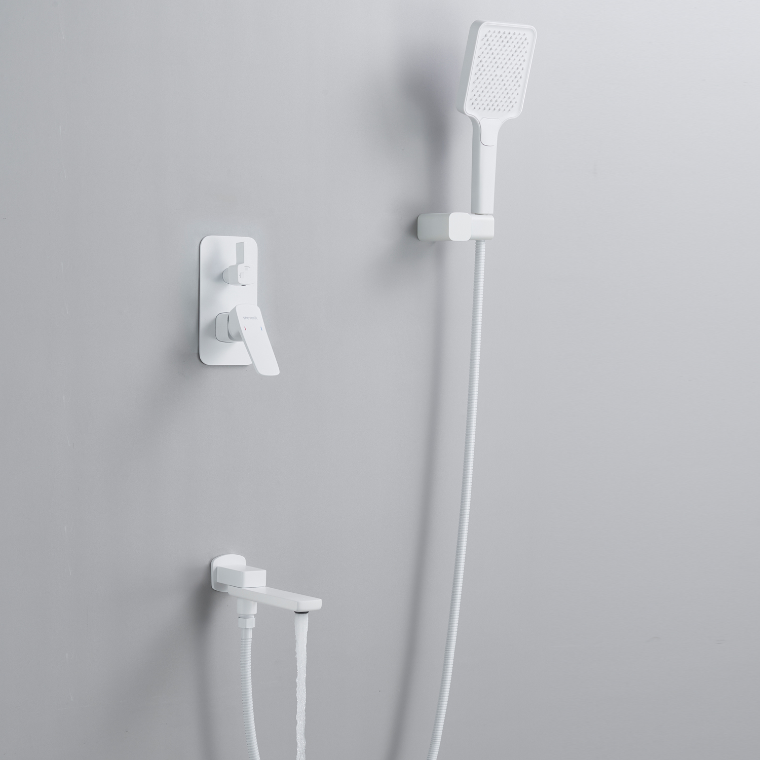 смеситель, внутренняя часть, шланговое подключение с изливом, верхний душ с настенным кронштейном, душевая лейка, настенный держатель лейки, душевой шланг