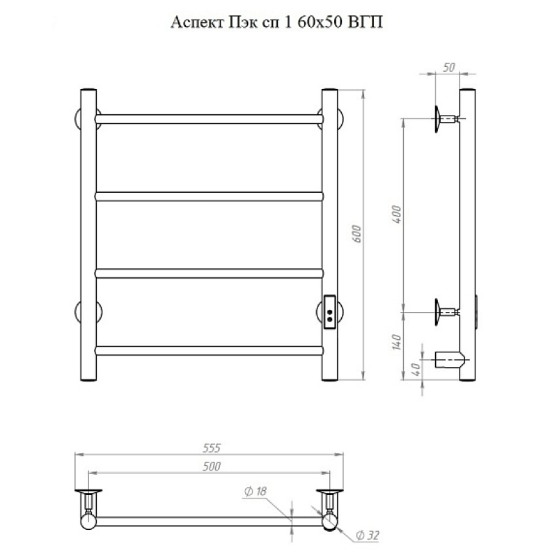 Полотенцесушитель Аспект Пэк сп 1 60х50 белый ВГП. Коллекция: Аспект Пэк сп 1 серия. Тип: электрический. Форма: лесенка. Мощность (Вт): не более 100Вт. Количество перекладин: 4. Материал: сталь. Подключение: скрытое электрическое соединение/электропровод с вилкой. Дополнительная информация: выключатель с таймером на 2, 4 и 6 часов работы и терморегулятором встроен в коллектор полотенцесушителя.