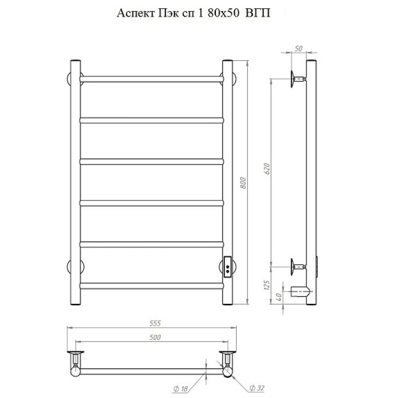 Полотенцесушитель Аспект Пэк сп 1 80х50 белый ВГП. Коллекция: Аспект Пэк сп 1 серия. Тип: электрический. Форма: лесенка. Мощность (Вт): не более 100Вт. Количество перекладин: 6. Материал: сталь. Подключение: скрытое электрическое соединение/электропровод с вилкой. Дополнительная информация: выключатель с таймером на 2, 4 и 6 часов работы и терморегулятором встроен в коллектор полотенцесушителя.