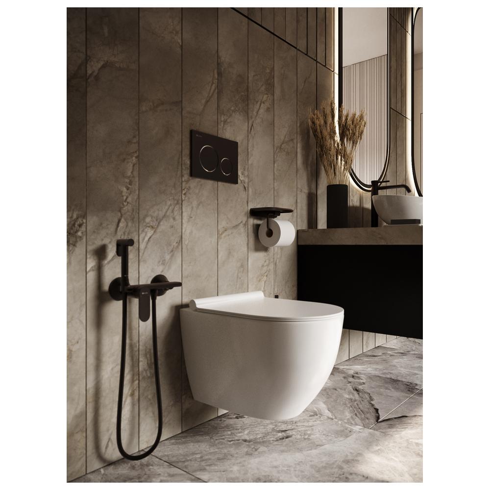 Модель гигиенического душа Knotlor с наружным монтажом в матово-черном цвете выглядит сдержанно и современно. Латунный корпус и покрытие MirrorShield обеспечивают надежность и устойчивость к внешним воздействиям. Есть полочка для телефона.
