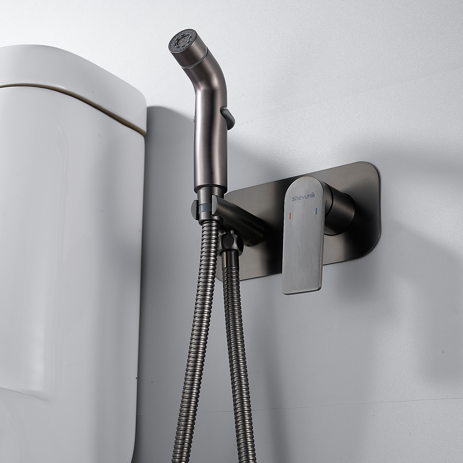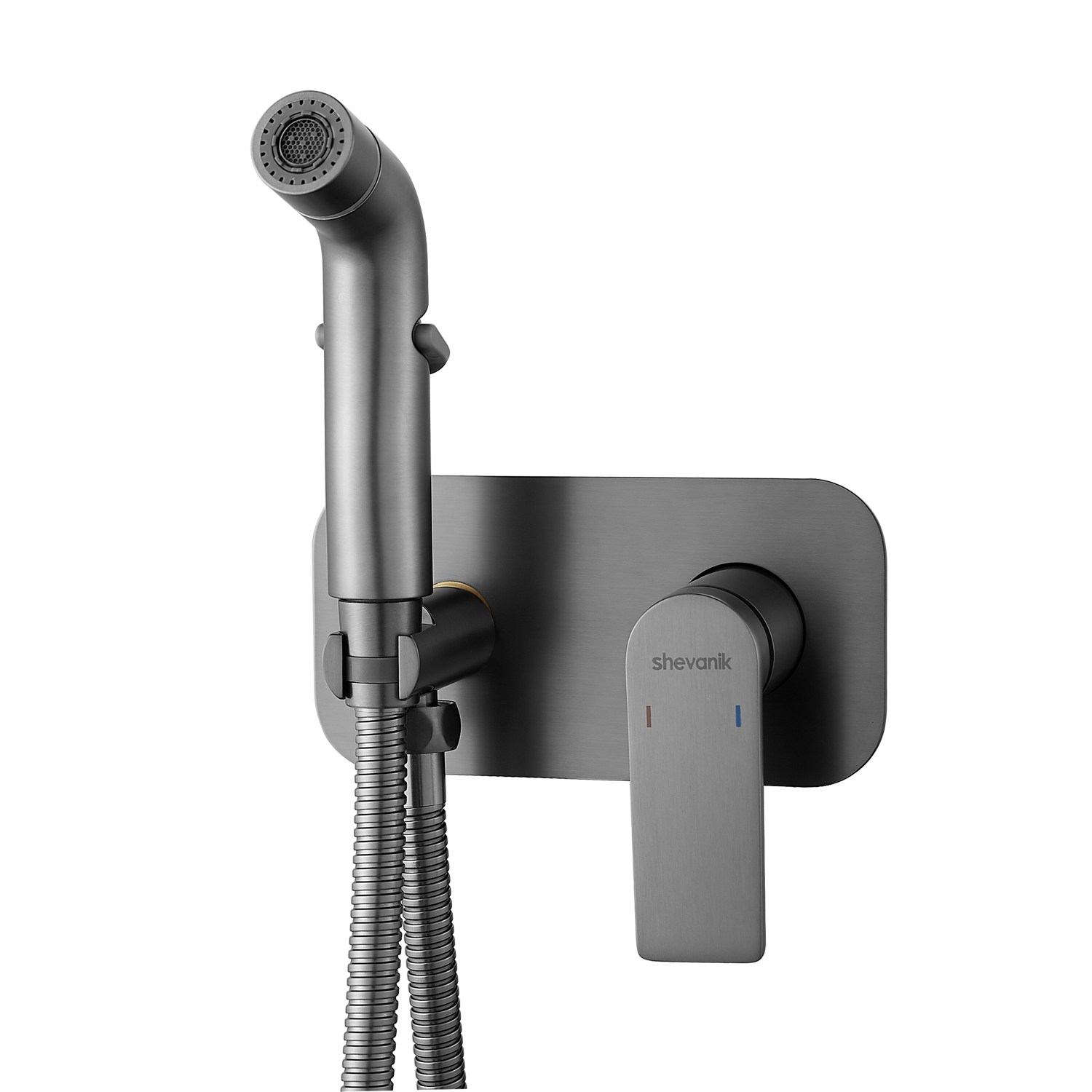 Гигиенический душ со смесителем Shevanik S4105T в современном цвете "оружейная сталь" — это идеальное решение для вашей ванной комнаты, сочетающее в себе элегантность и функциональность. Смеситель выполнен из прочной латуни, что гарантирует его долговечность и надежность. Благодаря скрытому монтажу в стену, он обеспечивает аккуратный и современный внешний вид, а керамический картридж и рычажное управление делают его использование легким и удобным.