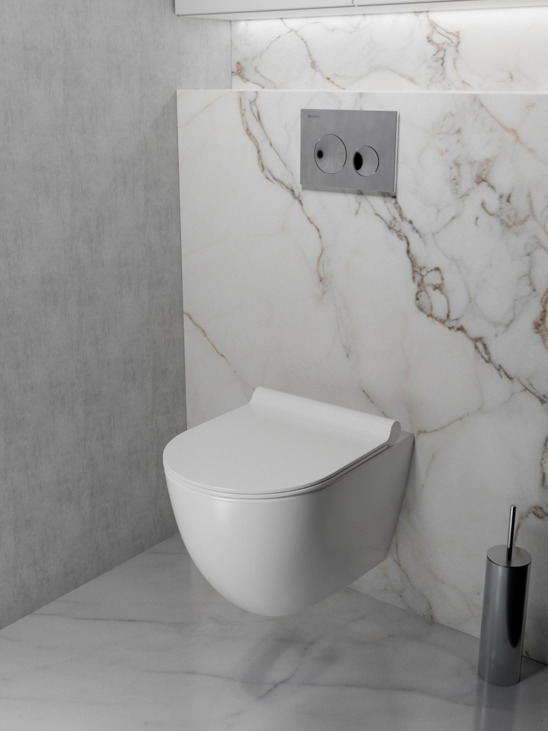 Элегантный дизайн с округлыми формами и углубленными кнопками в цвете хром, создающими визуальный объем. Подходит для современных интерьеров. Идеально сочетается с унитазом Essence WC49WG.