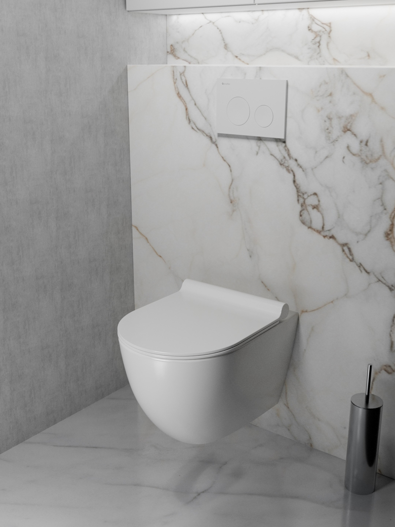 Элегантный дизайн с округлыми формами и углубленными кнопками в матовом белом цвете, создающими визуальный объем. Подходит для современных интерьеров. Идеально сочетается с унитазом Essence WC49WG.