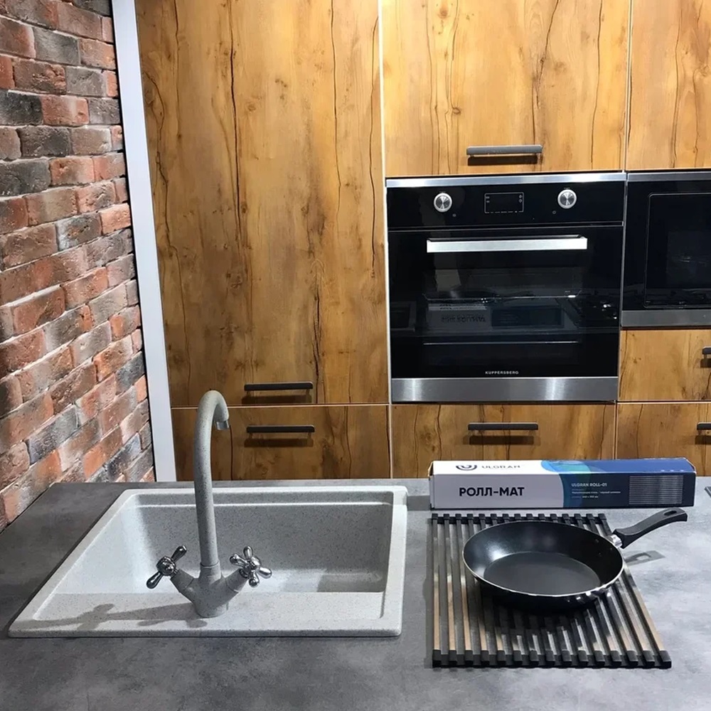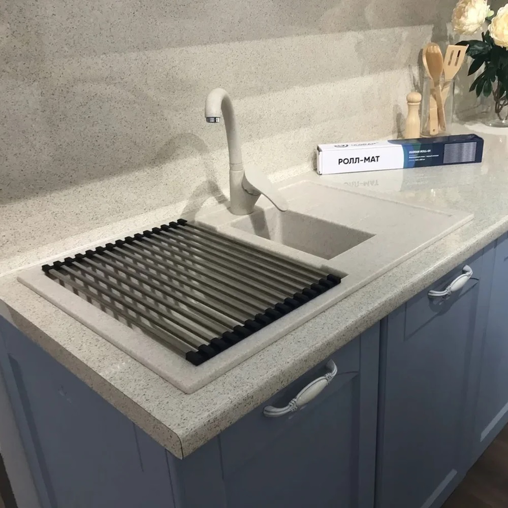 Ролл-мат ULGRAN ROLL-01 – удобный и современный аксессуар для кухни, который расстилается на крыле или на чаше мойки, а также на столешнице. На нем можно сушить посуду, овощи и фрукты (без контакта с поверхностью), разделывать и чистить рыбу. Также ролл-мат используется в качестве подставки под горячее, в том числе и на столешнице из искусственного камня. Он легко скручивается в компактный рулон и занимает мало места при хранении.