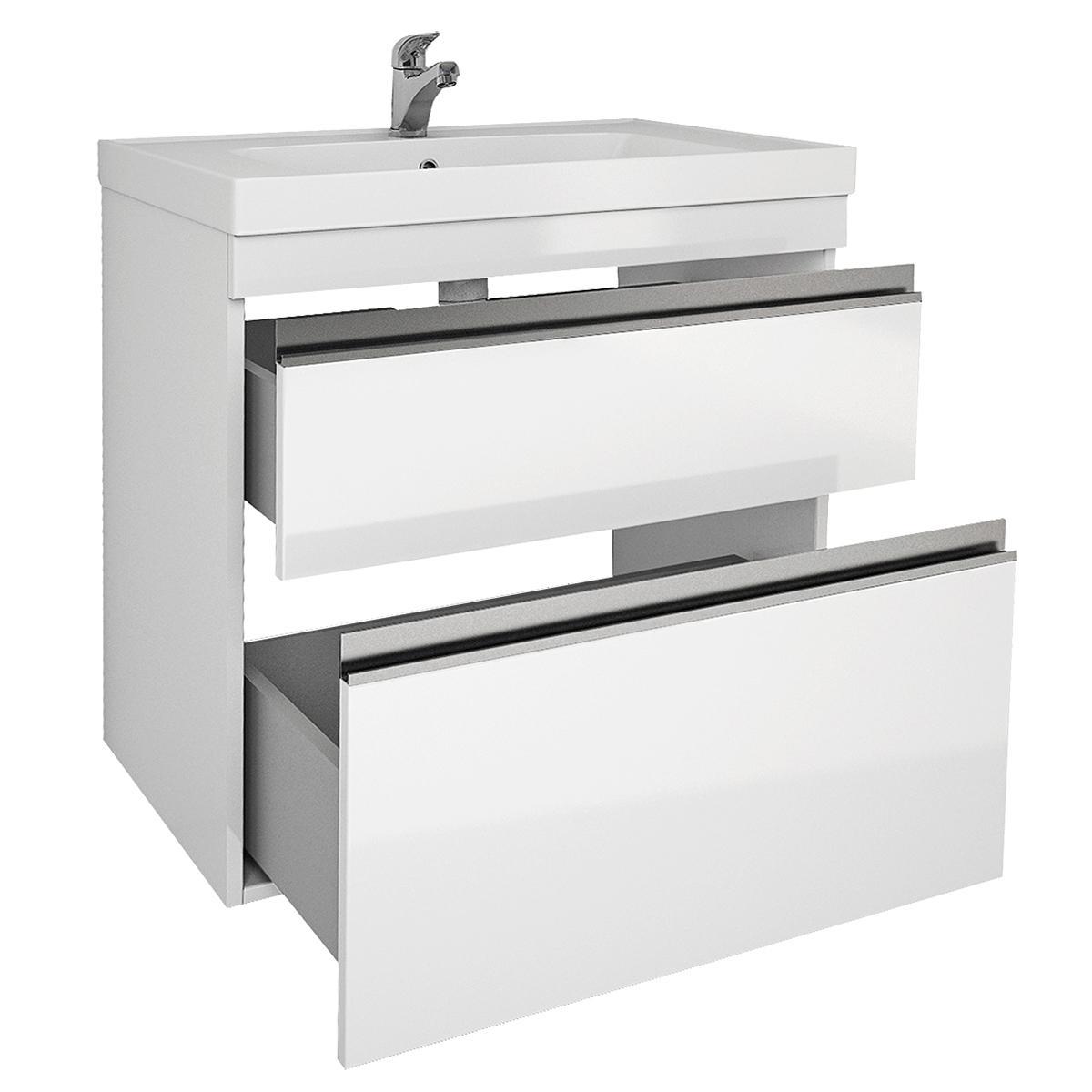 Тумба под раковину подвесная/напольная Dreja Grace Plus 70 см, белый. Фурнитура: Hettich. Компоновка: 2 ящика. Дополнительные функции: встроенный органайзер в верхнем ящике. Монтаж: подвесной/напольный. Для монтажа необходимо закрепить тумбу к стене и использовать входящие в комплект поставки опоры. Раковина арт.: 641600 в комплекте.