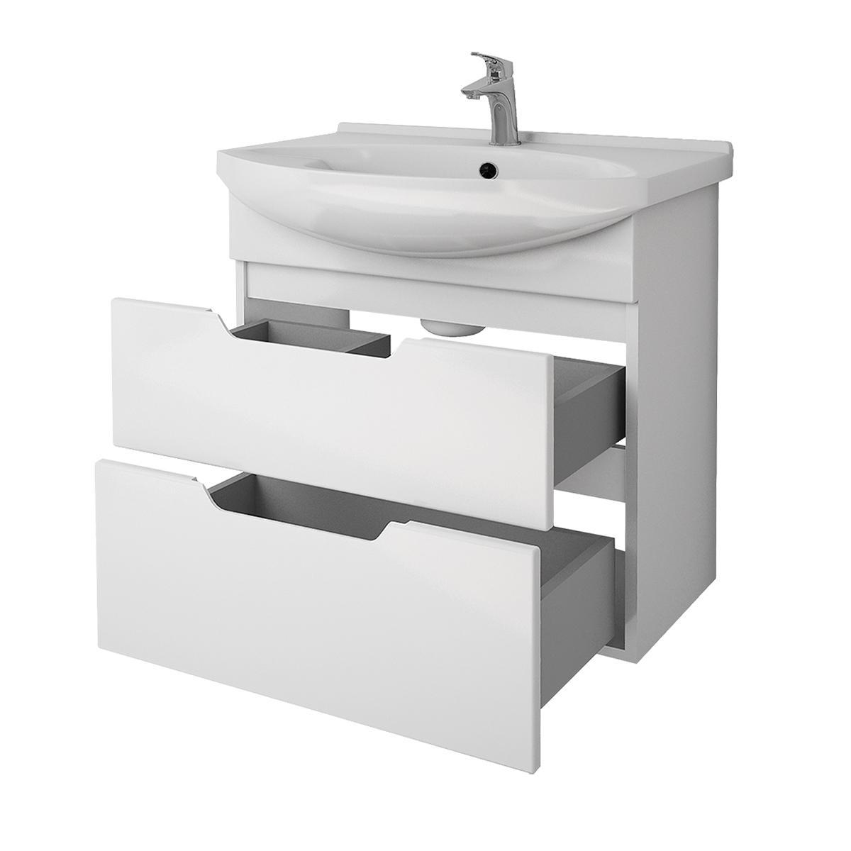 Тумба под раковину подвесная/напольная Dreja Laguna Plus 85 см, белый. Фурнитура: Hettich. Компоновка: 2 ящика. Дополнительные функции: встроенный органайзер в верхнем ящике. Монтаж: подвесной/напольный. Для монтажа необходимо закрепить тумбу к стене и использовать входящие в комплект поставки опоры. Раковина арт.: 191676 в комплекте.