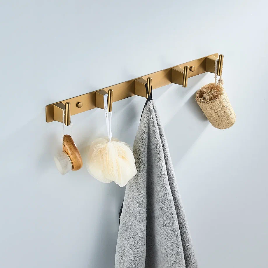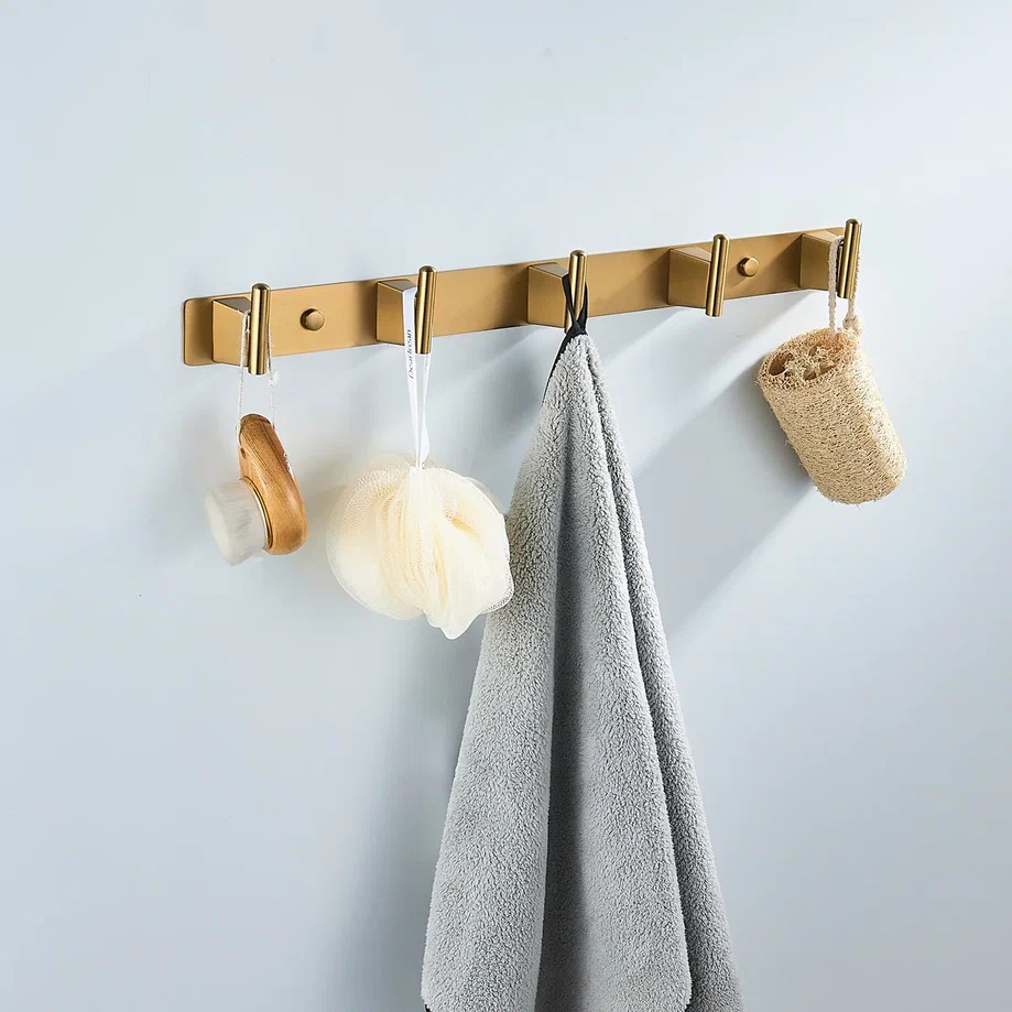 Планка с пятью крючками Shevanik SG5751G в современном цвете "золотой сатин" (брашированное золото) — это стильное и практичное решение для организации пространства в вашем доме. Изготовленная из прочной нержавеющей стали, эта планка обеспечивает долговечность и надёжность, устойчива к влаге и механическим воздействиям, что делает её идеальным выбором для использования в ванных комнатах, кухнях и других помещениях.