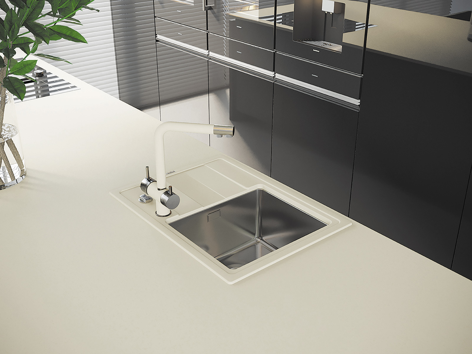 Мойка под шкаф 45 см. Материал столешницы мойки - кварцевый композит. Материал чаши мойки - нержавеющая сталь марки AISI 304, толщина 1 мм. В комплект входит отводная арматура с выпуском 3 ½ ” (D=90 мм) и переливом, набор крепежей, трафарет. Модель оборачиваемая.