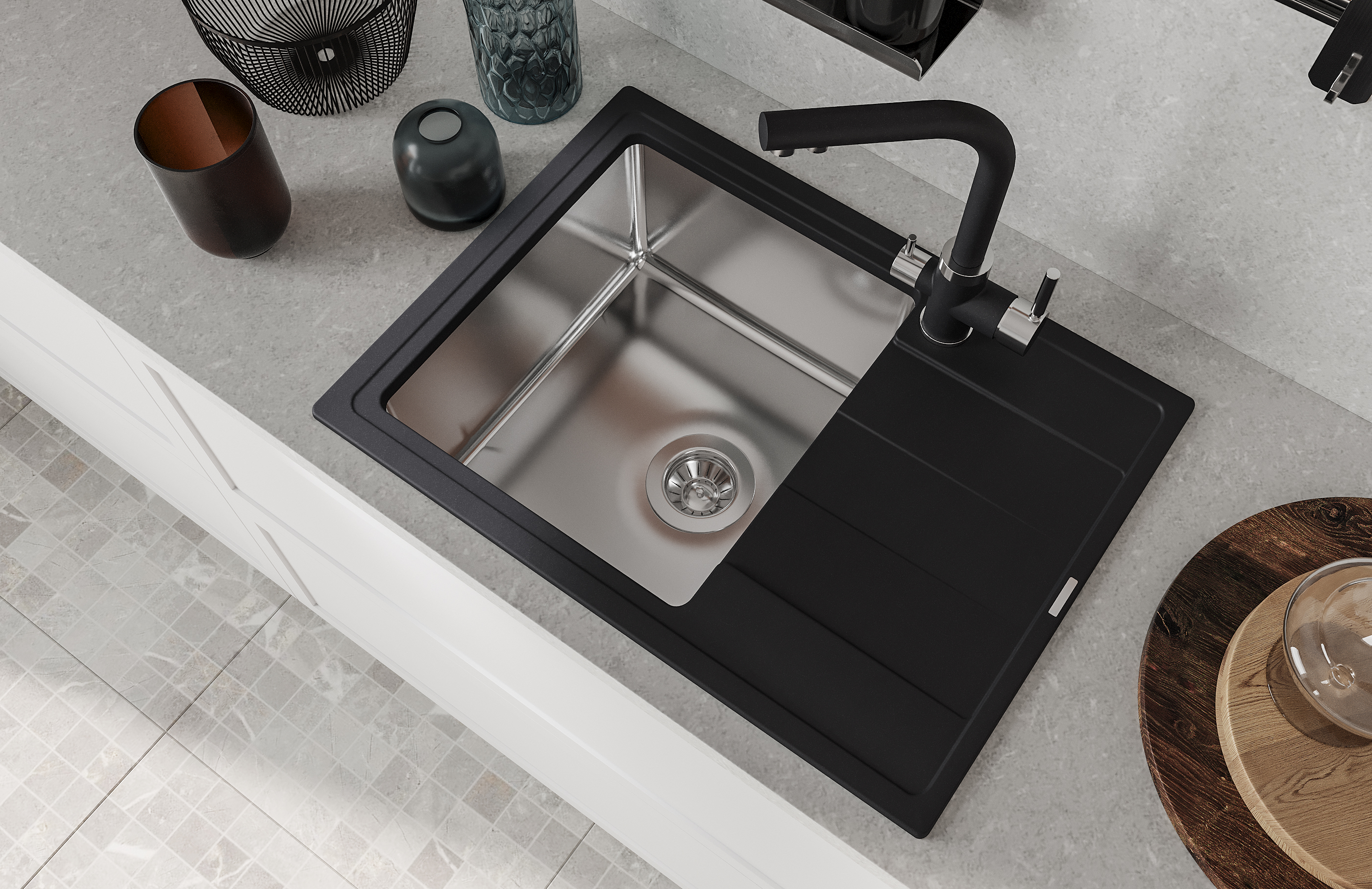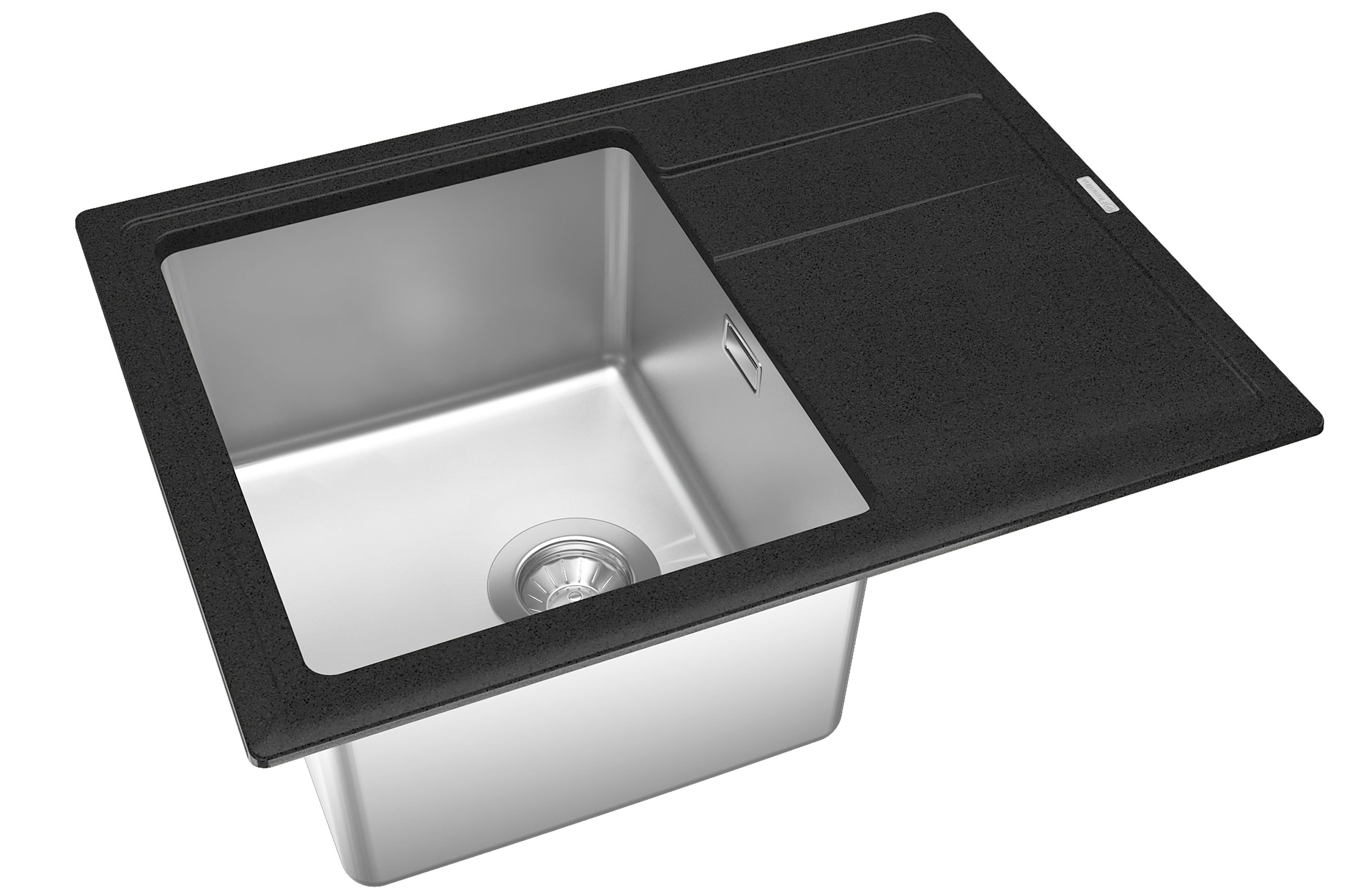 Мойка под шкаф 45 см. Материал столешницы мойки - кварцевый композит. Материал чаши мойки - нержавеющая сталь марки AISI 304, толщина 1 мм. В комплект входит отводная арматура с выпуском 3 ½ ” (D=90 мм) и переливом, набор крепежей, трафарет. Модель оборачиваемая.