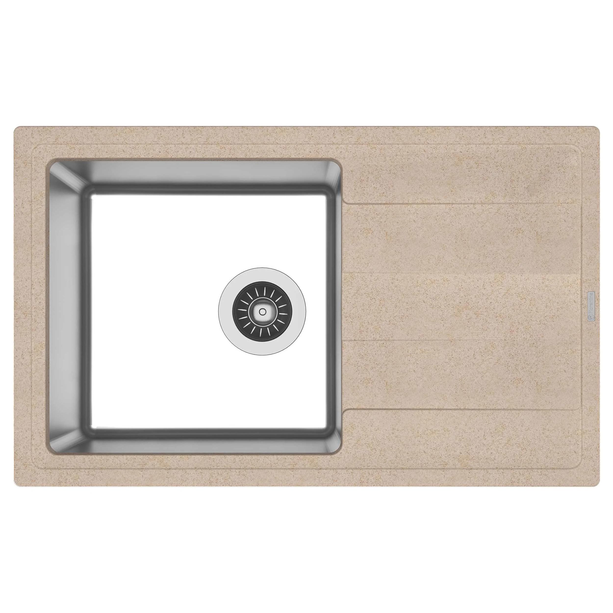 Мойка под шкаф 60 см. Материал столешницы мойки - кварцевый композит. Материал чаши мойки - нержавеющая сталь марки AISI 304, толщина 1 мм. В комплект входит отводная арматура с выпуском 3 ½ ” (D=90 мм) и переливом, набор крепежей, трафарет. Модель оборачиваемая.