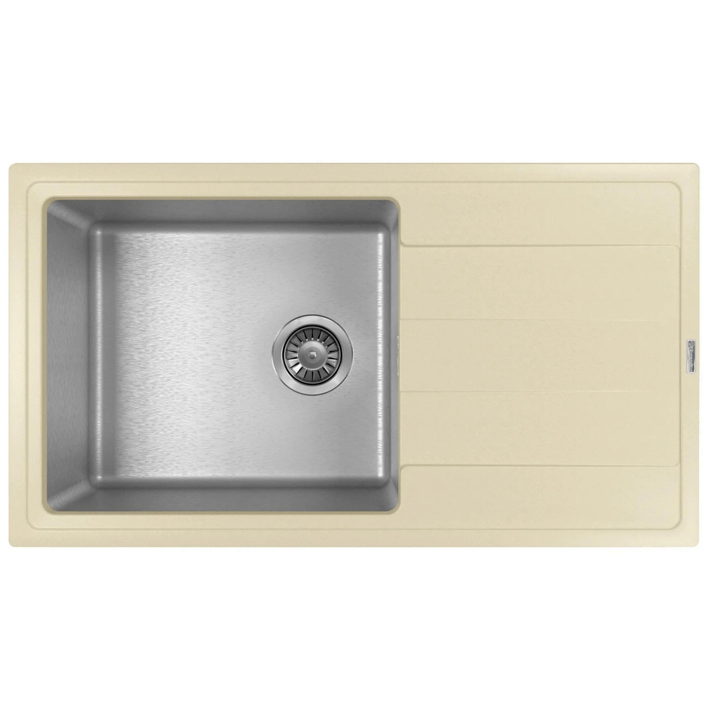 Мойка под шкаф 60 см. Материал столешницы мойки - кварцевый композит. Материал чаши мойки - нержавеющая сталь марки AISI 304, толщина 1 мм. В комплект входит отводная арматура с выпуском 3 ½ ” (D=90 мм) и переливом, набор крепежей, трафарет. Модель оборачиваемая.