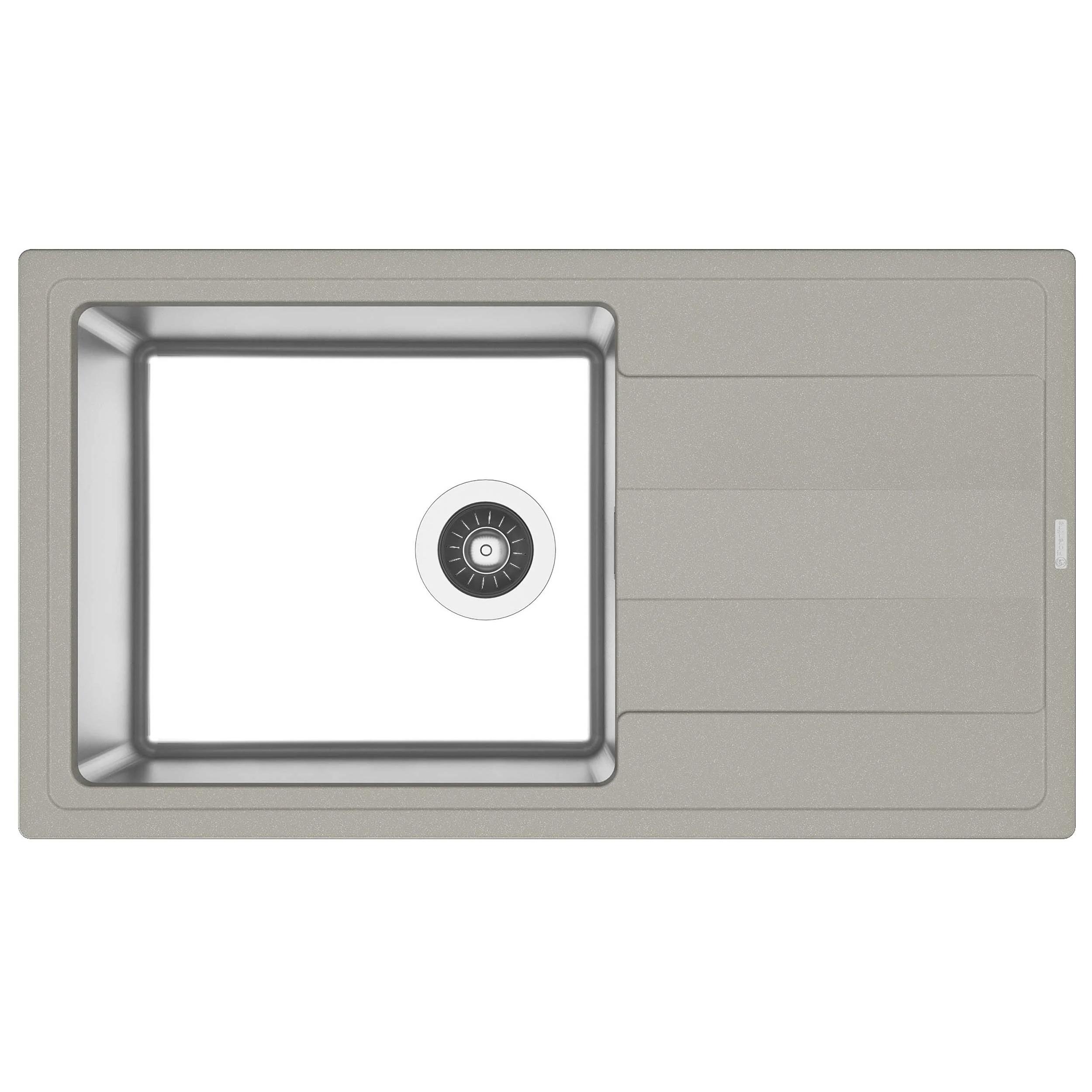 Мойка под шкаф 60 см. Материал столешницы мойки - кварцевый композит. Материал чаши мойки - нержавеющая сталь марки AISI 304, толщина 1 мм. В комплект входит отводная арматура с выпуском 3 ½ ” (D=90 мм) и переливом, набор крепежей, трафарет. Модель оборачиваемая.