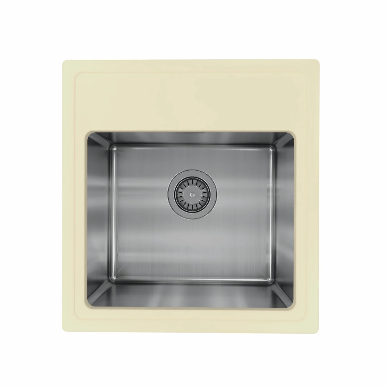 Мойка под шкаф 45 см. Материал столешницы мойки - кварцевый композит. Материал чаши мойки - нержавеющая сталь марки AISI 304, толщина 1 мм. В комплект входит отводная арматура с выпуском 3 ½ ” (D=90 мм) и переливом, набор крепежей, трафарет.