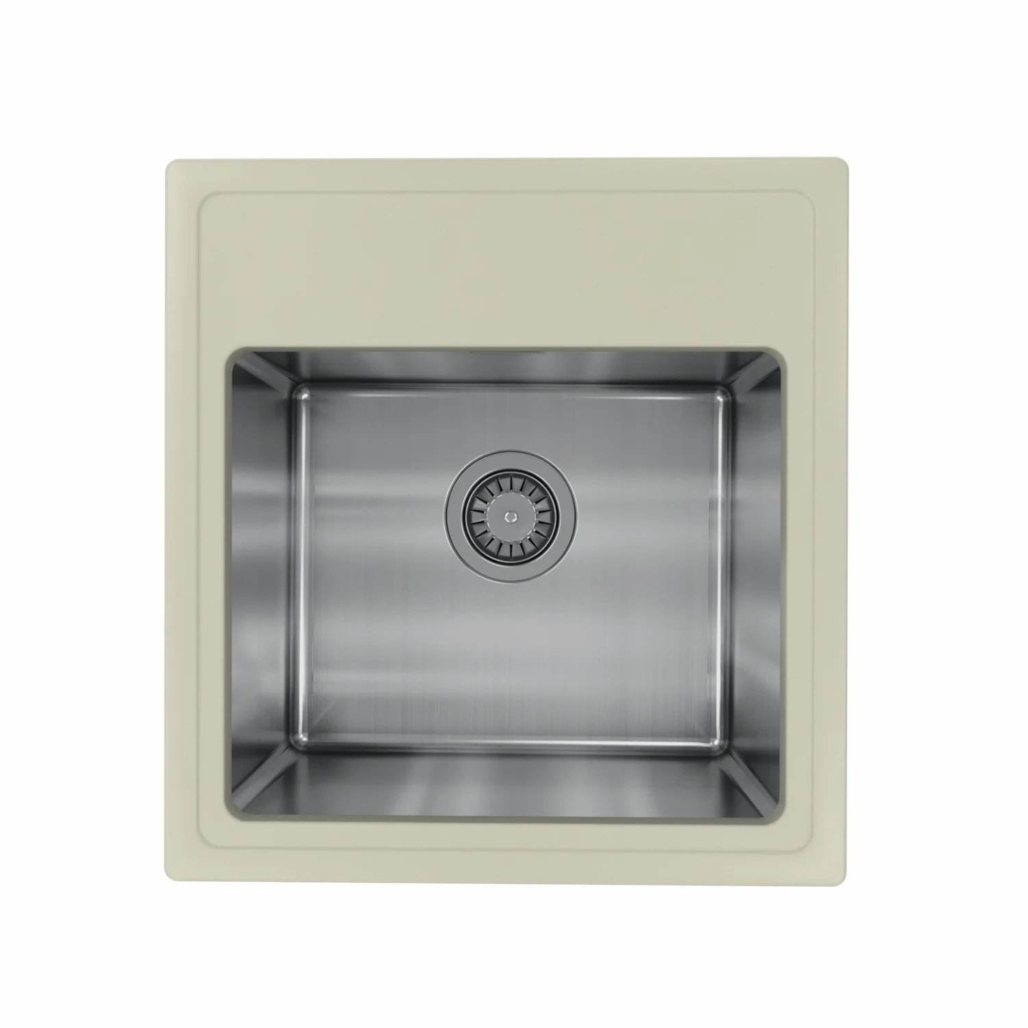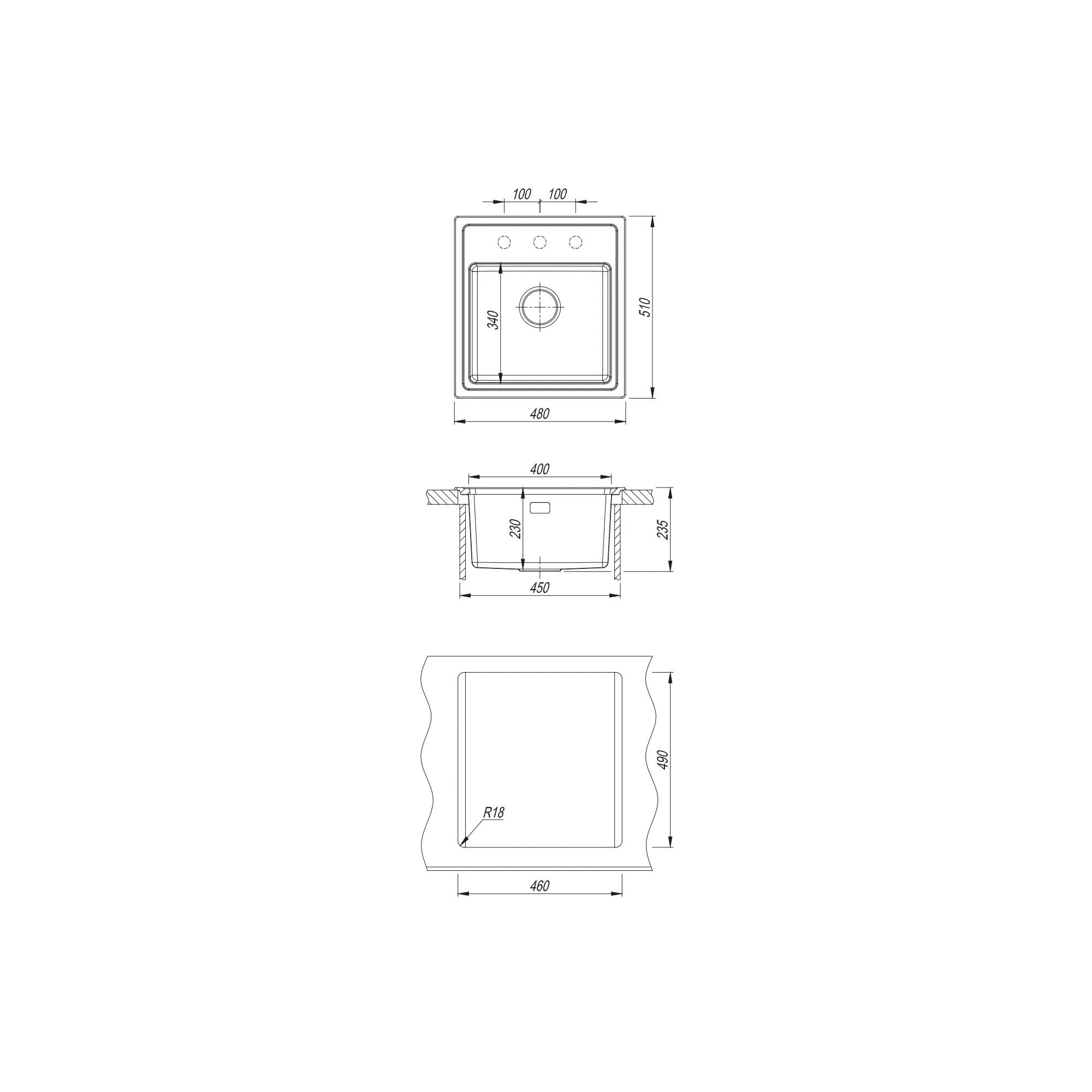 Мойка под шкаф 45 см. Материал столешницы мойки - кварцевый композит. Материал чаши мойки - нержавеющая сталь марки AISI 304, толщина 1 мм. В комплект входит отводная арматура с выпуском 3 ½ ” (D=90 мм) и переливом, набор крепежей, трафарет.
