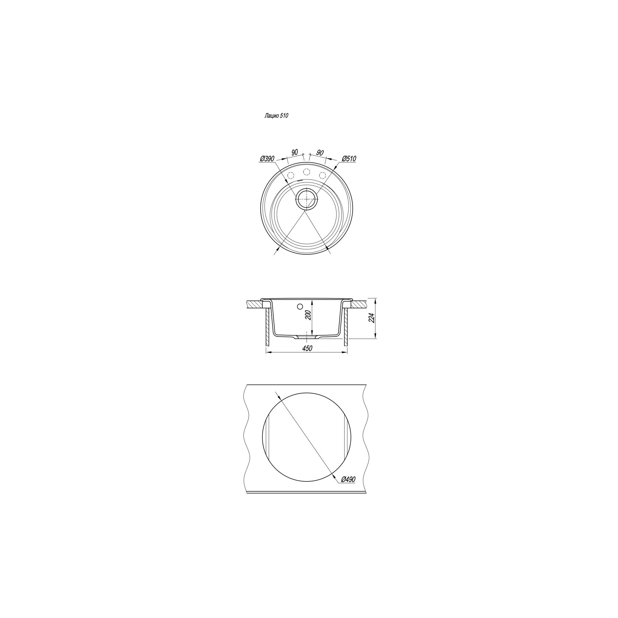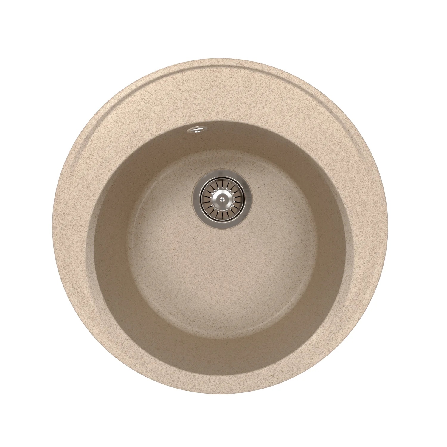 Круглая мойка с большой чашей для кухонного шкафа 45 см. Материал — кварцевый композит. Предусмотрены дополнительные отверстия для установки аксессуаров.