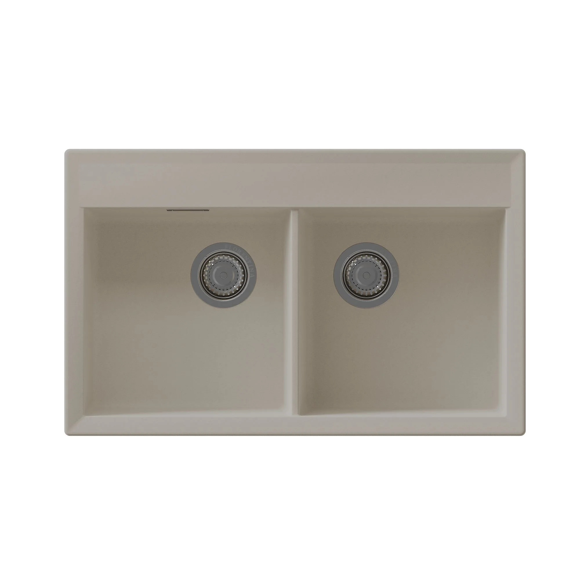 Прямоугольная мойка с двумя большими чашами для кухонного шкафа 80 см. Материал — кварцевый композит. Предусмотрены доп. отверстия для установки аксессуаров.