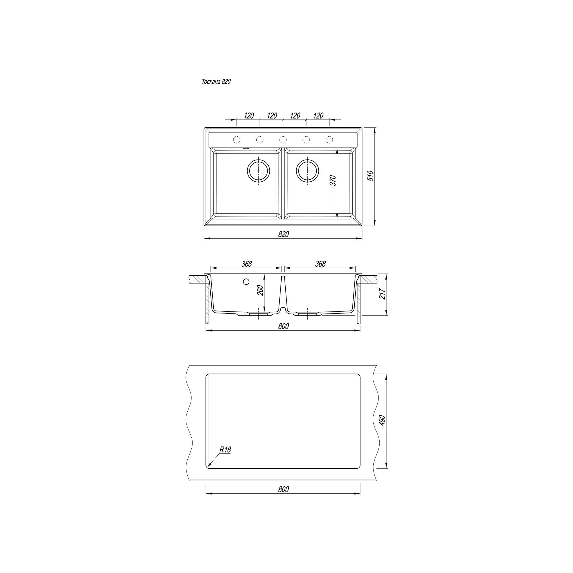Прямоугольная мойка с двумя большими чашами для кухонного шкафа 80 см. Материал — кварцевый композит. Предусмотрены доп. отверстия для установки аксессуаров.