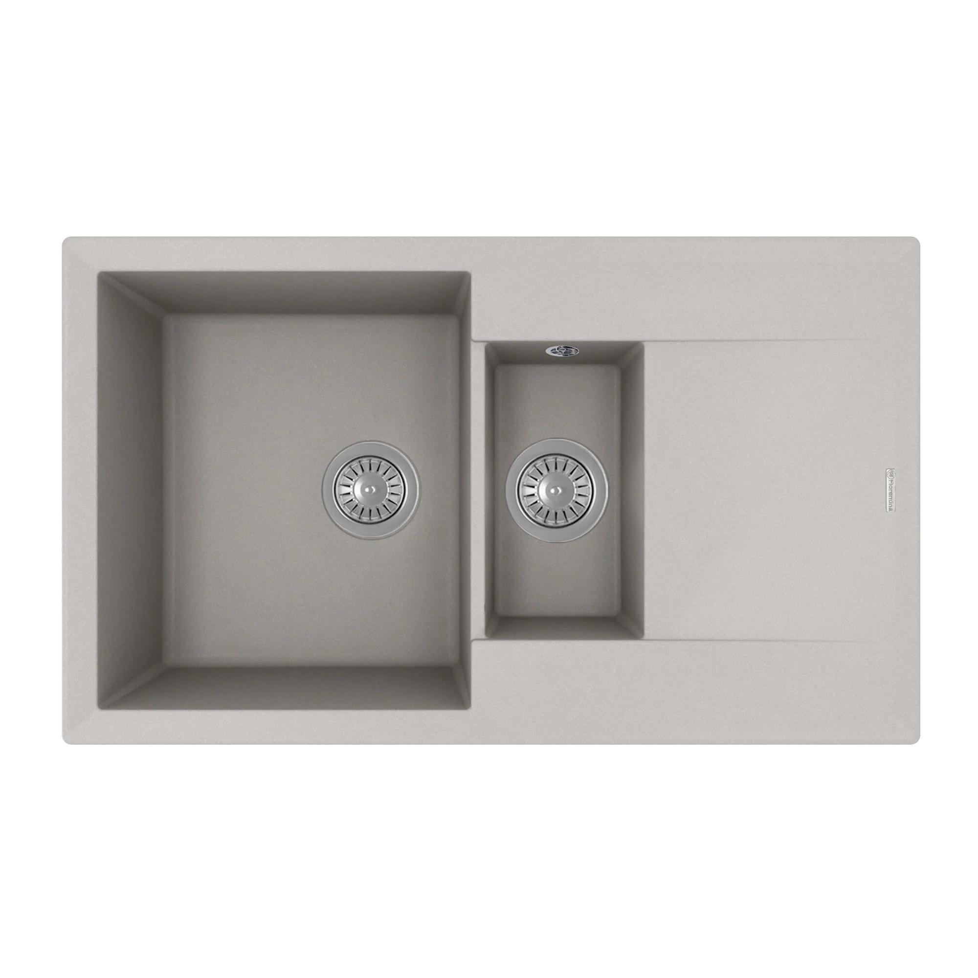 Прямоугольная мойка с большой и малой чашами для кухонного шкафа 60 см. Материал — кварцевый композит. Предусмотрены доп. отверстия для установки аксессуаров.