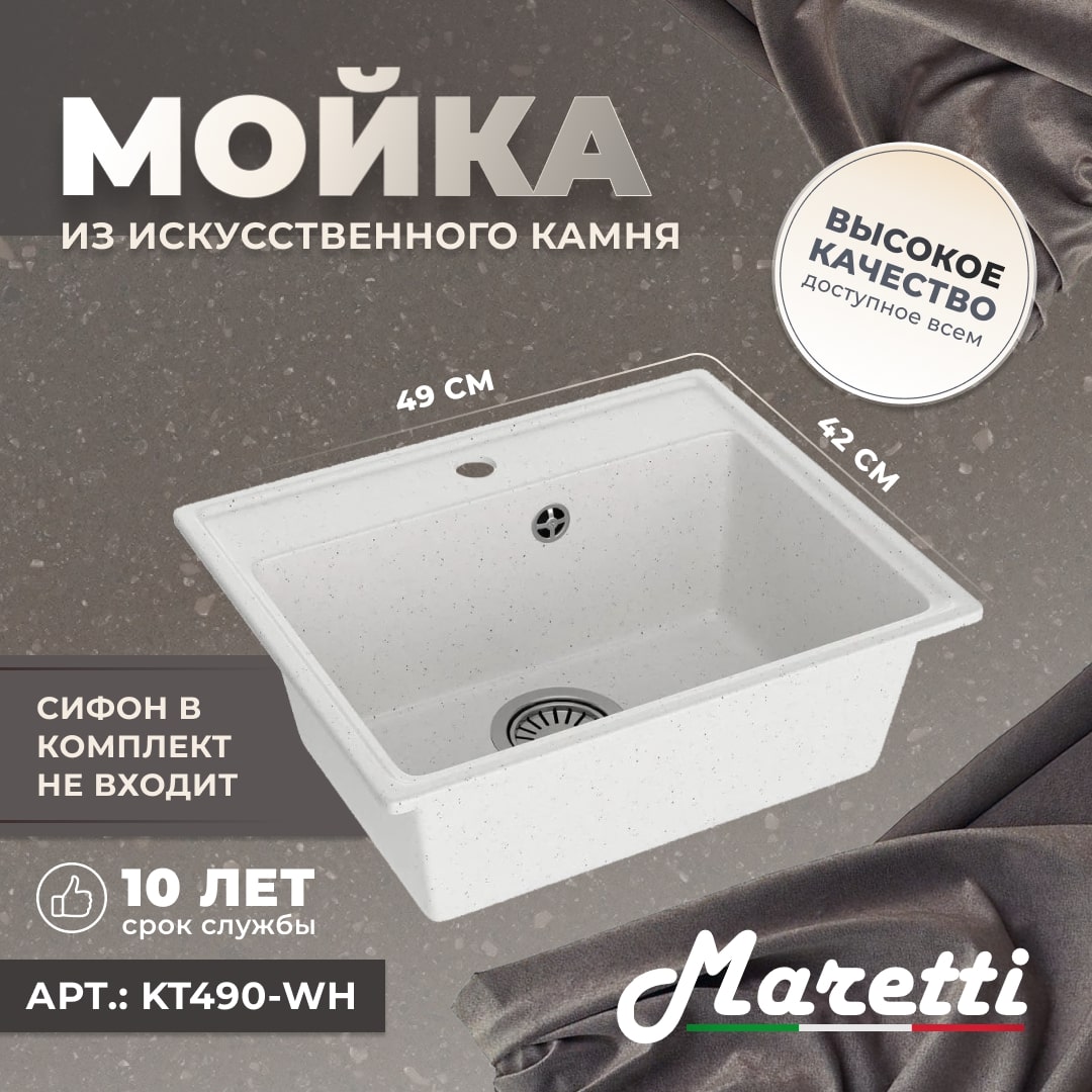 Прямоугольная кухонная мойка Maretti Kitchen 490 с отверстием для смесителя идеально подойдёт для небольшой кухни. Она изготовлена из искусственного камня, который состоит из натурального мрамора и связующих смол. Благодаря этому материалу, шум от падающей воды становится значительно меньше.