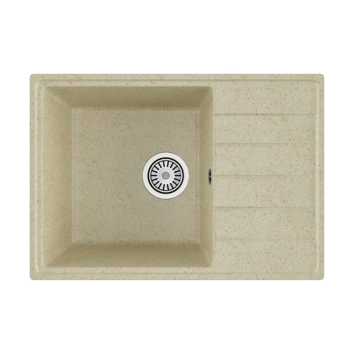 Мойка изготовлена из искусственного камня, который представляет собой композит натурального мрамора и связующих смол. Благодаря этому материалу, шум от падающей воды становится значительно тише.