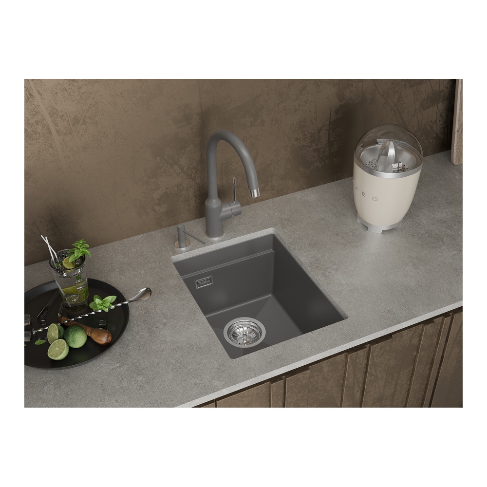 Кухонная мойка Rivelato LINO LN-354, серый металлик. Для кухонного шкафа 40 см. Материал — кварцевый композит. Производство: Италия. Гарантийный срок: 5 лет.
