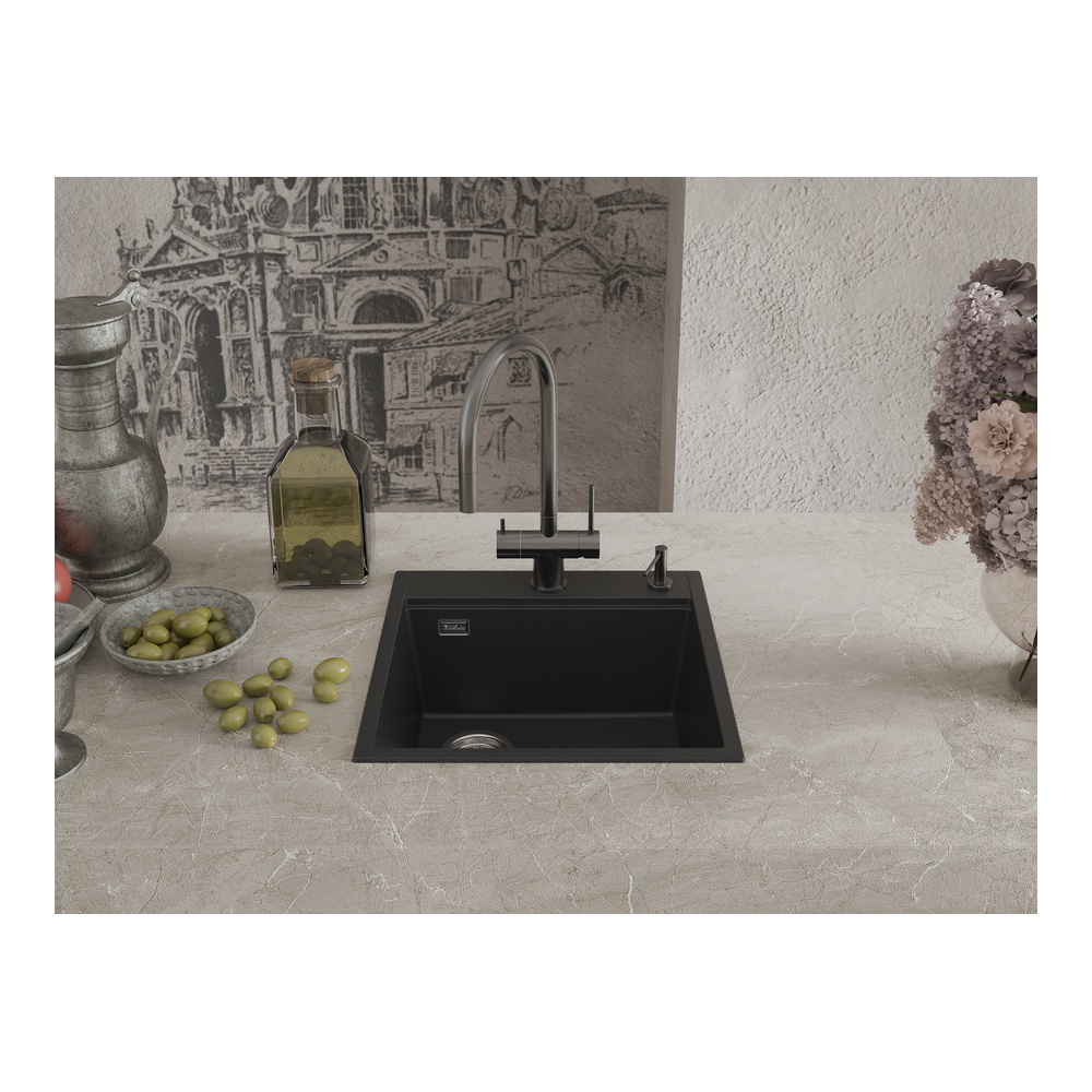 Кухонная мойка Rivelato TESORO TR-505-L, черный. Для кухонного шкафа 50 см. Материал — кварцевый композит. Производство: Италия. Гарантийный срок: 5 лет.