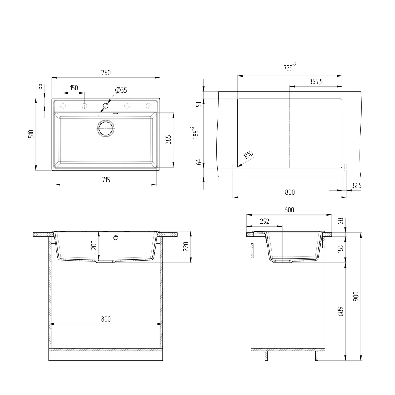 Кухонная мойка ULGRAN Quartz Forte 760 является односекционной, с отверстием под смеситель, при этом существуют 4 дополнительно намеченных отверстия под аксессуары (дозатор или клапан-автомат). Мойка устанавливается в кухонный шкаф шириной от 80 см. В комплектацию входят: сливная арматура серии «Элит» с гофротрубой, технический паспорт и гарантийный талон. Данная кухонная мойка имеет современный минималистичный дизайн и легко может стать украшением кухни и настоящим эргономичным центром. Заводская гарантия составляет 7 лет, а срок службы данной мойки, при соблюдении основных правил ухода за ней, составляет более 20 лет.