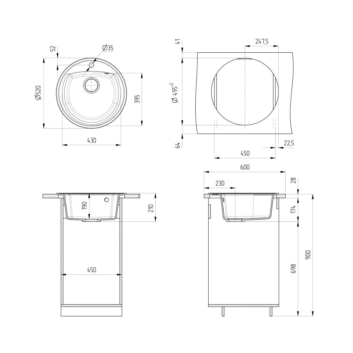 ULGRAN U-603 - круглая кухонная мойка с вместительной чашей и отверстием под смеситель. Данная мойка устанавливается в шкаф шириной от 45 см. В комплектацию входит сливная арматура с гофротрубой, технический паспорт и гарантийный талон. Существует возможность установки дозатора ULGRAN слева от смесителя - доп. отверстие в таком случае потребитель делает самостоятельно с помощью фрезы Форстнера (не входит в комплектацию и приобретается отдельно). Заводская гарантия составляет 2 года, а срок службы данной мойки, при соблюдении основных правил ухода за ней, составляет более 10 лет.