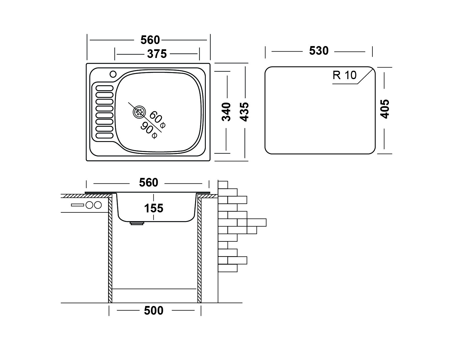 Мойка врезного способа монтажа имеет размеры 560х435 мм и предназначена для установки в тумбу от 45 см. Такая раковина идеально подойдет для небольшой кухни.