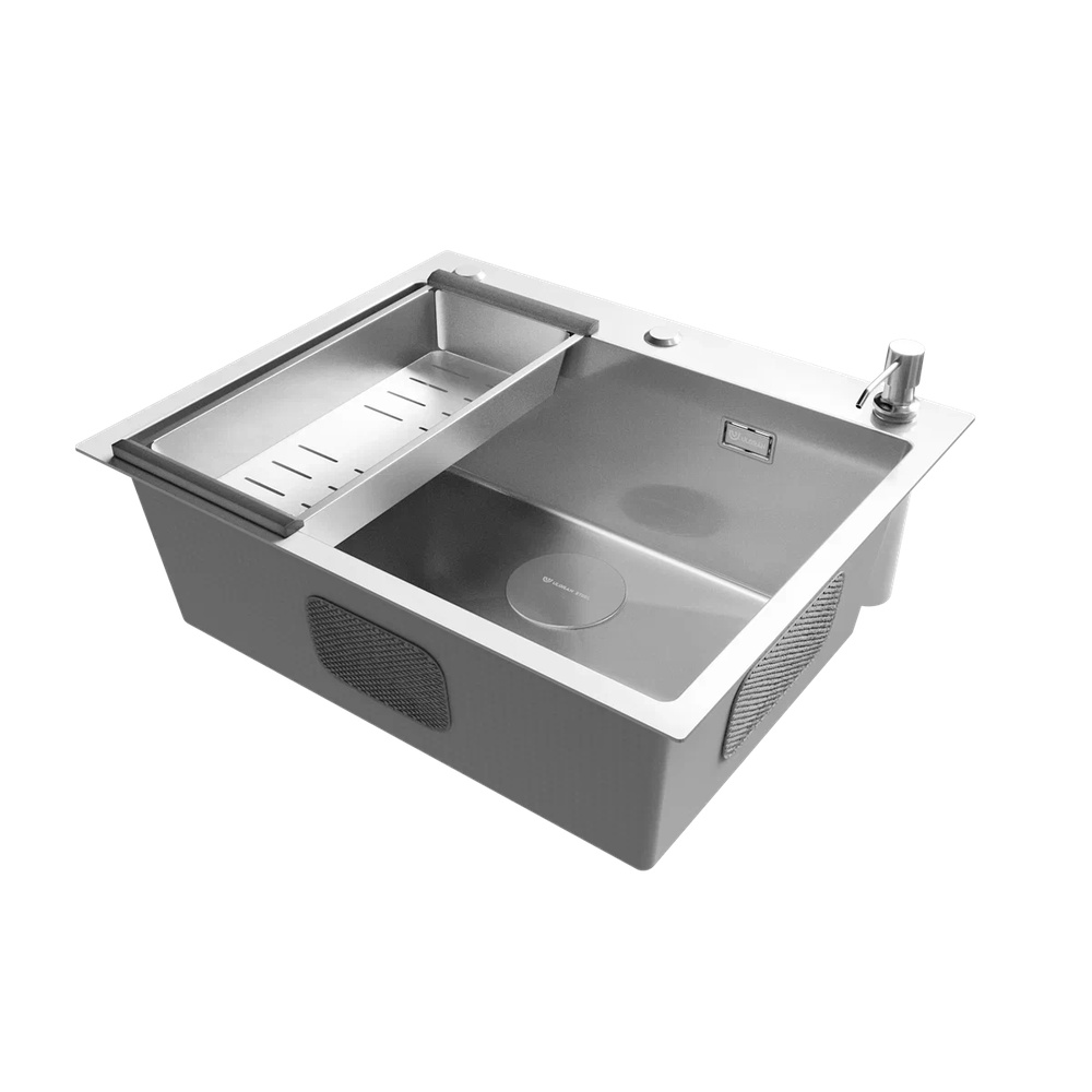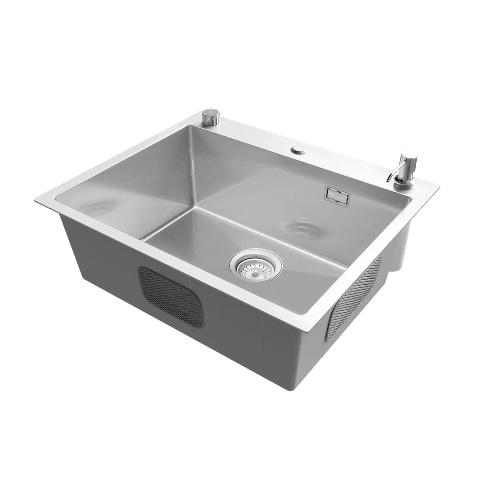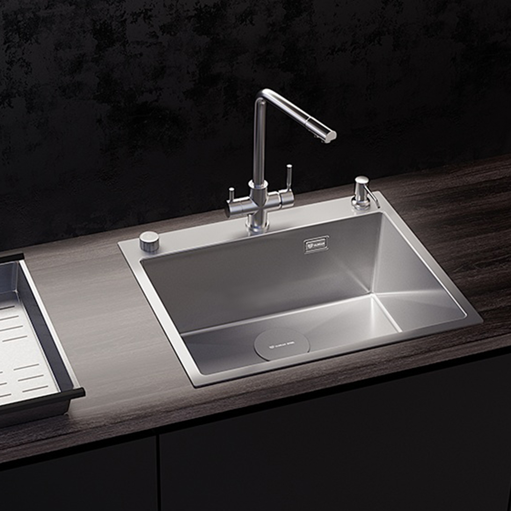Мойка имеет богатую комплектацию, состоящую из дозатора, коландера из хирургической стали и высококачественной сливной арматуры с клапаном-полуавтоматом, также сливное отверстие имеет брендированную заглушку.