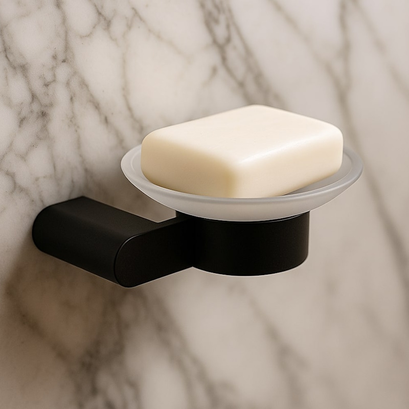 Подвесная мыльница BLISS в матовом черном с матовым стеклом. Настенный монтаж экономит место, корпус из SUS 304 с антиследовым покрытием долговечен и удобен в уходе.