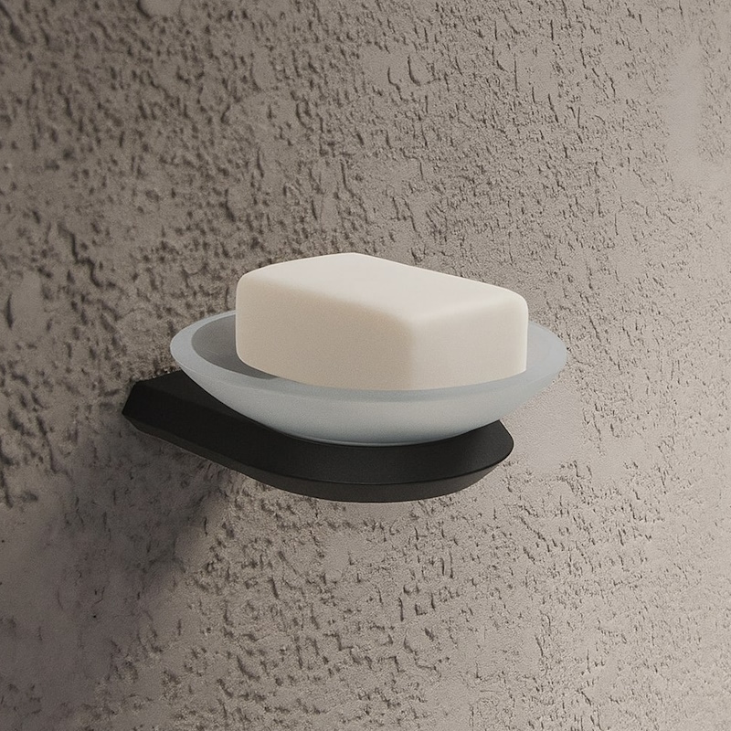 Подвесная мыльница SPACE в матовом черном цвете с матовым стеклом. Настенный монтаж освобождает столешницу, корпус ZAMAK + SUS-201 долговечен и удобен в уходе.