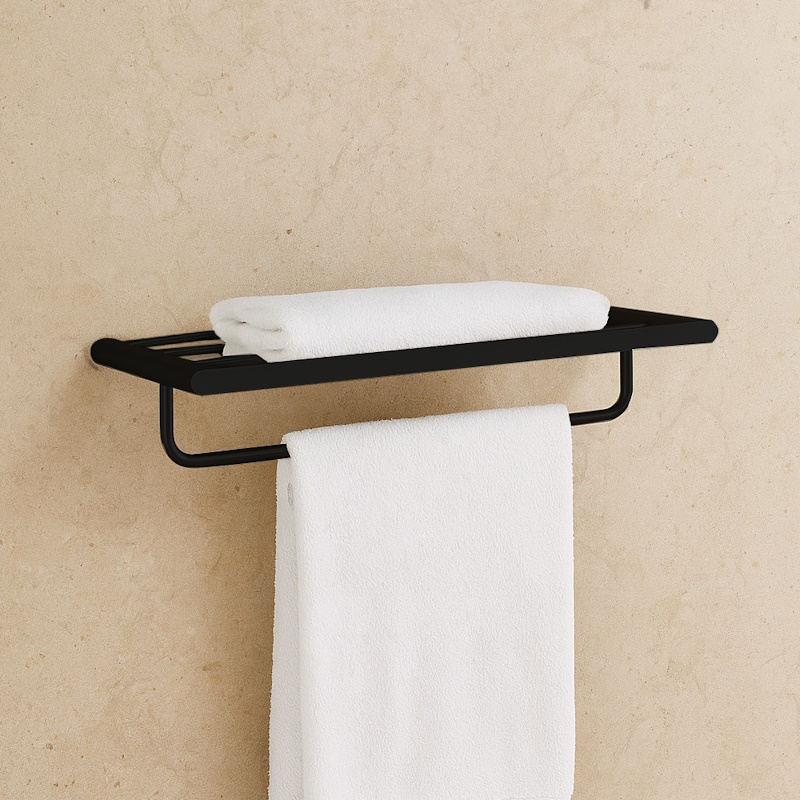 Стильная полка для полотенец в матовом чёрном исполнении подчеркнёт характер и современность интерьера. Прочная нержавеющая сталь и матовая текстура придают изделию премиальный вид и защищают от царапин.