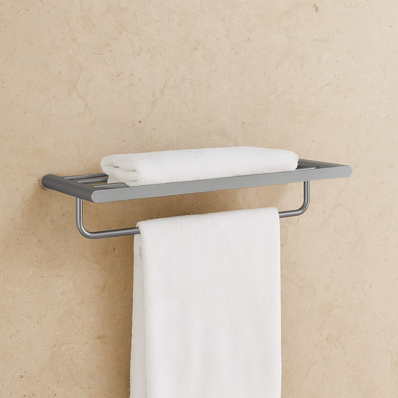 Полка для полотенец в матовой стали сочетает сдержанную элегантность и высокую износостойкость. Такая отделка легко сочетается с любыми сантехническими элементами, создавая гармонию в ванной комнате.