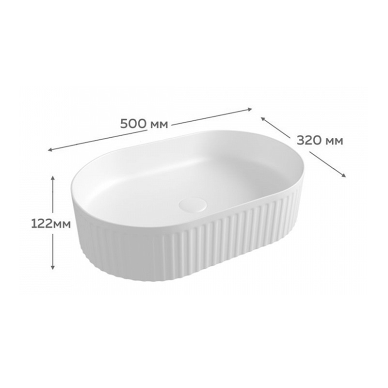 Раковина имеет оптимальные размеры: ширина — 50 см, глубина — 32 см, высота — 12,2 см. Это позволяет удобно разместить её на столешнице в ванной комнате. Диаметр слива составляет 4,5 см, что обеспечивает быстрый и эффективный отвод воды.