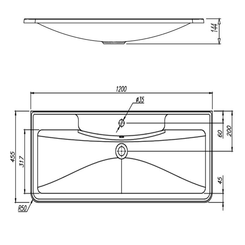 Раковина АЛЛЕГРО 1200. Размер: 1200х455х144 мм.