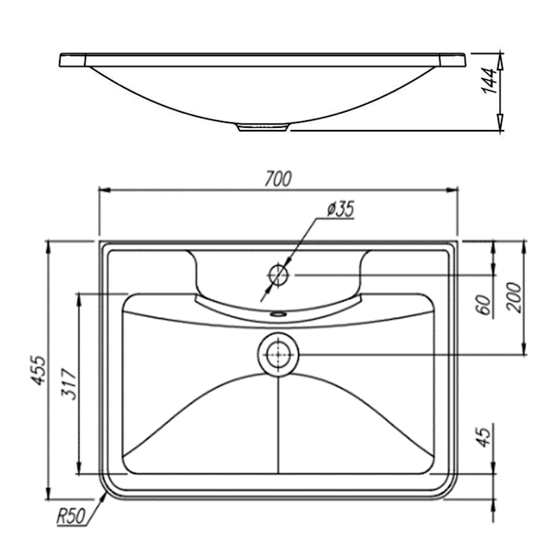Раковина АЛЛЕГРО 700. Размер: 700х455х144 мм.