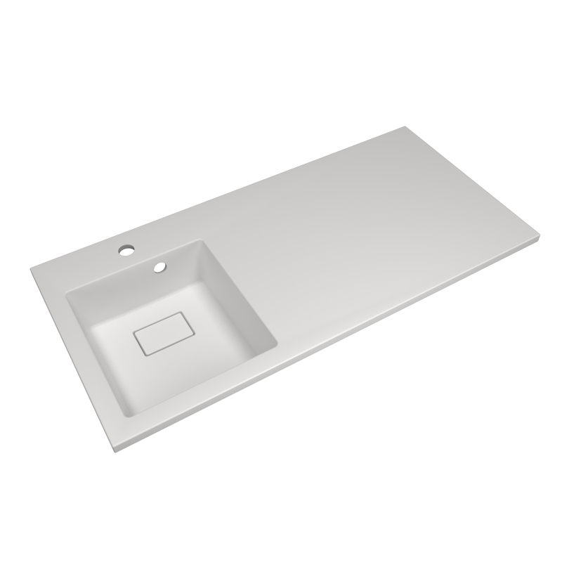 Раковина представляет единую литую поверхность, которая состоит из чаши и широкой столешницы. В зависимости от дизайн-решения ванной комнаты под столешницей можно разместить стиральную машину или мебельную тумбу.