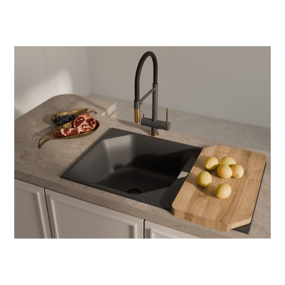 Специально разработанная разделочная доска из массива бука устанавливается на бортики мойки и может передвигаться по ним. Вы всегда можете преобразовать мойку в рабочую поверхность.