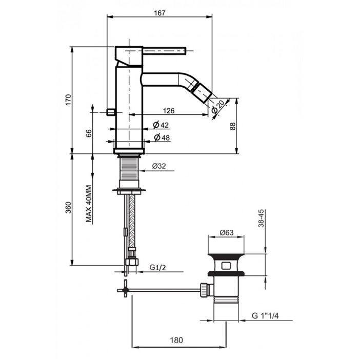 Донный клапан G1 1/4. Рычаг управления донным клапаном на корпусе смесителя