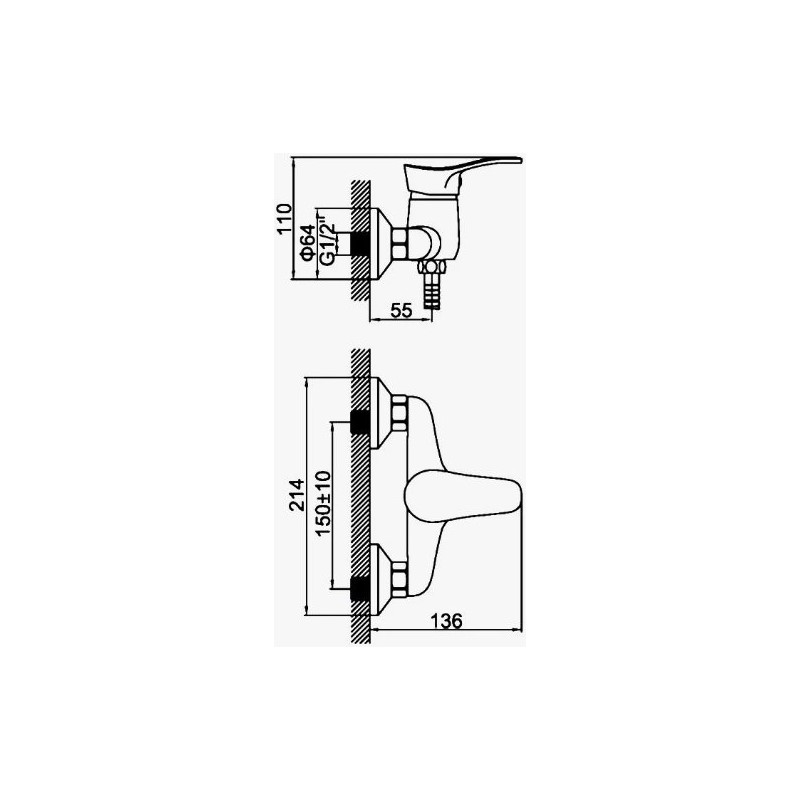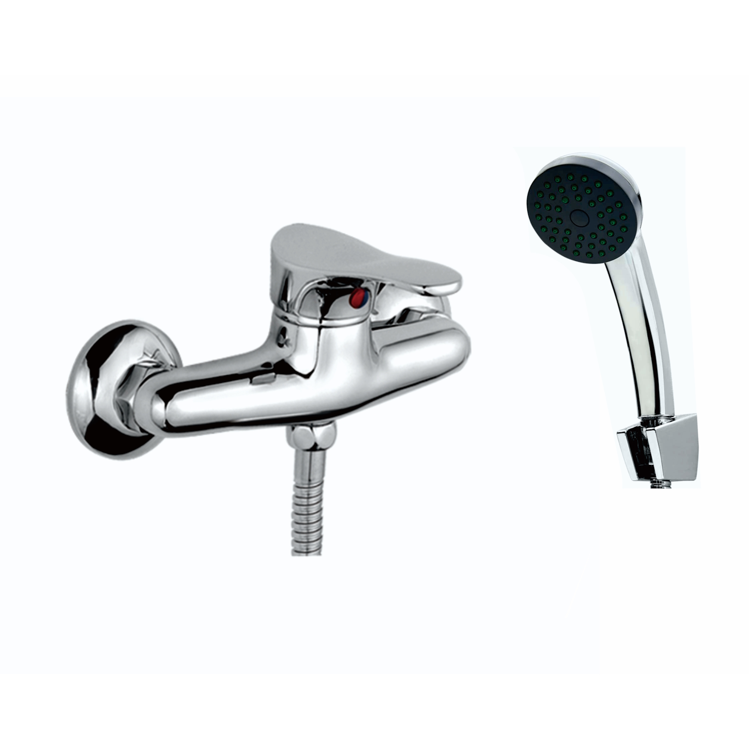 Смеситель, душевой шланг, душевая лейка, держатель лейки, эксцентрики, декоративные чашки.