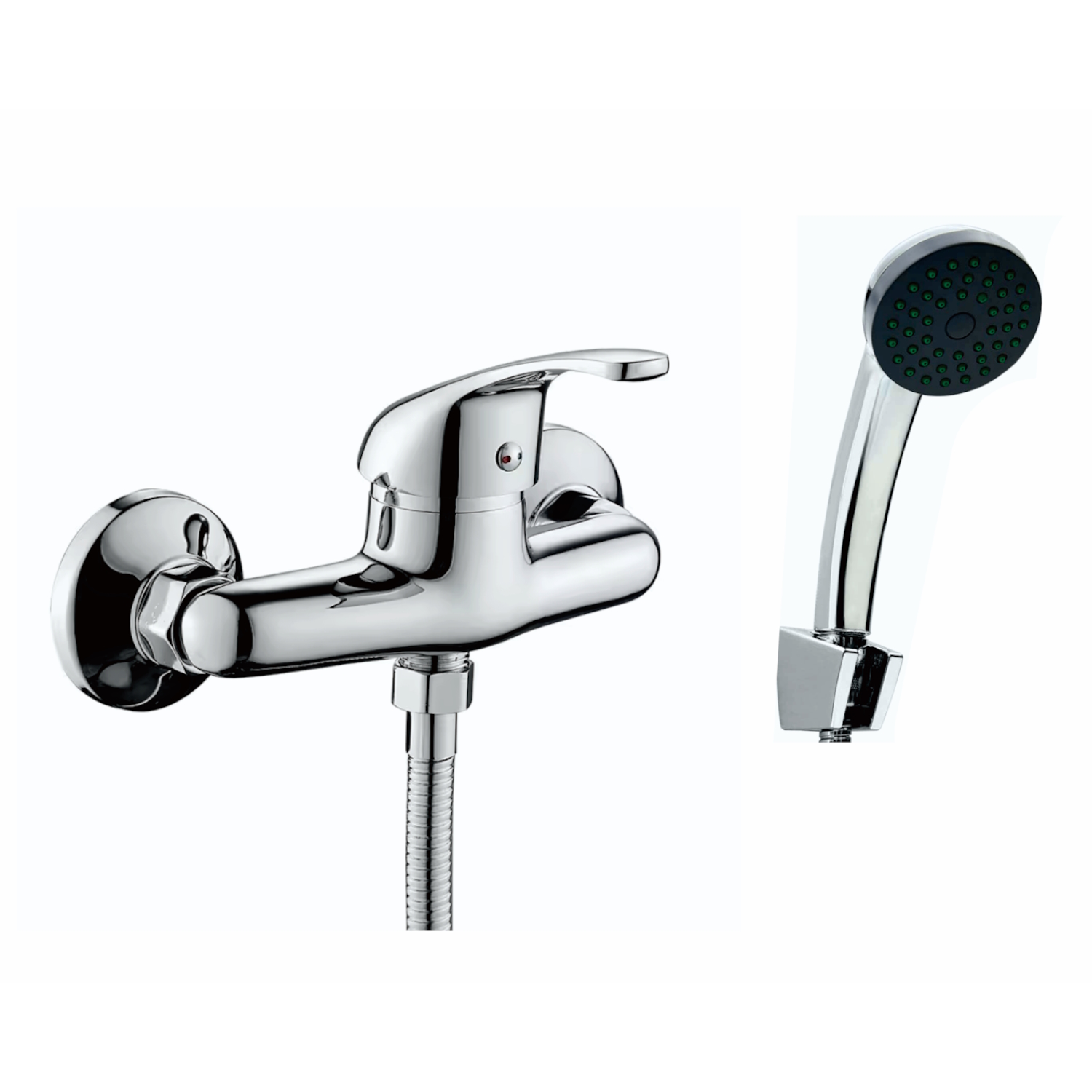 Смеситель, душевой шланг, душевая лейка, держатель лейки, эксцентрики, декоративные чашки.
