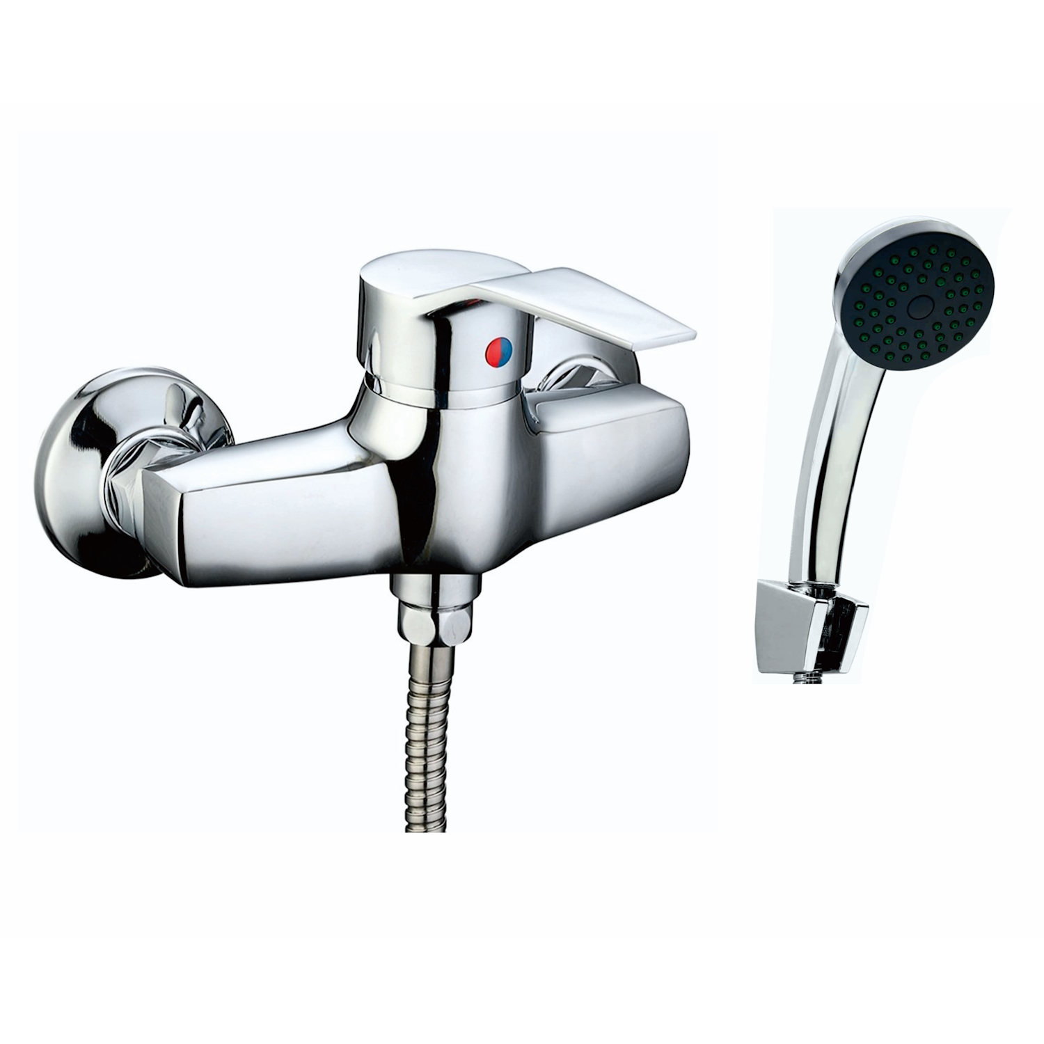 Смеситель, душевой шланг, душевая лейка, держатель лейки, эксцентрики, декоративные чашки.