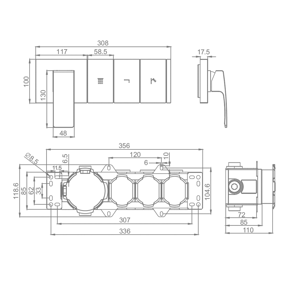 Корпус смесителя + внутренняя часть Raglo R02.273.09, 3-режима, графит. Встраиваемый монтаж. Керамический картридж 40 мм. Управление рычажное + кнопочное.