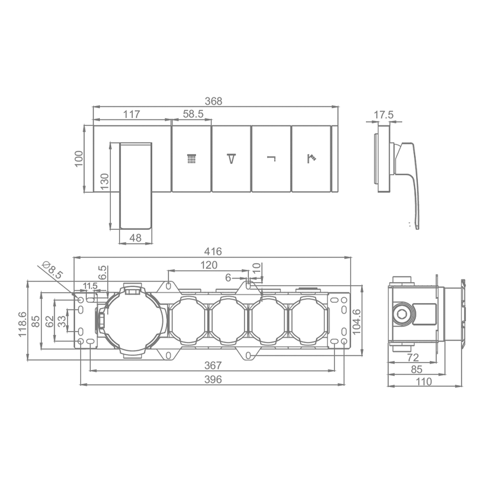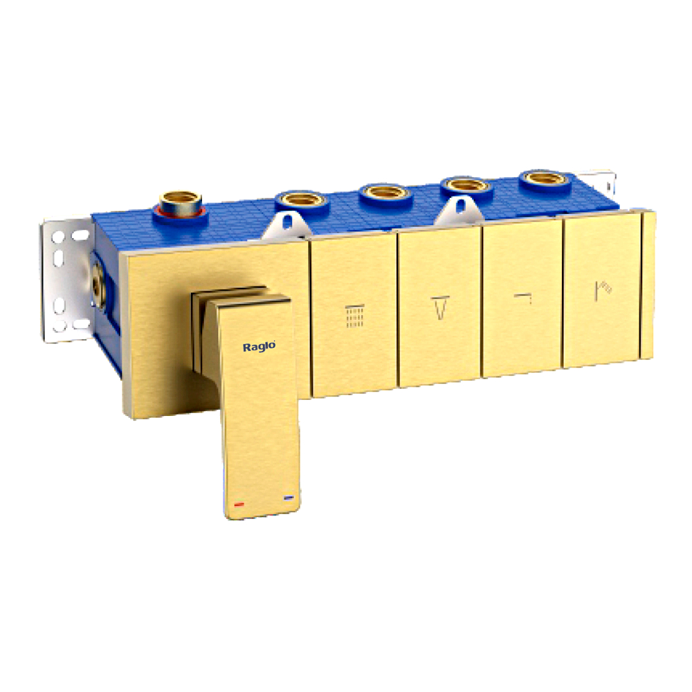 Корпус смесителя + внутренняя часть Raglo R02.274.03, 4-режима, золотой сатин (брашированное золото). Встраиваемый монтаж. Керамический картридж 40 мм. Управление рычажное + кнопочное.